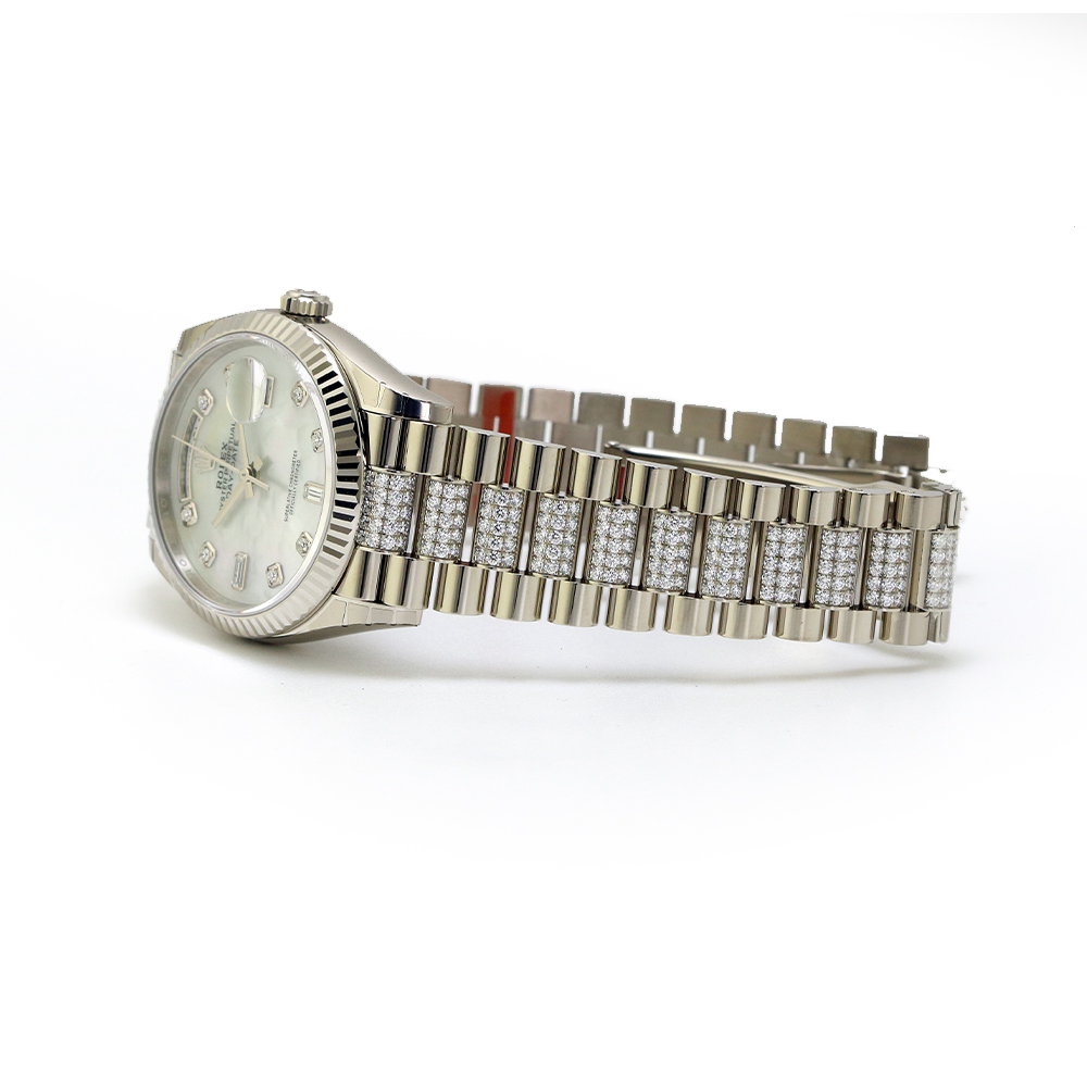 ホワイトマザーオブパール、ダイヤモンド入りダイアル、フルーテッドベゼルとダイヤモンド入りプレジデント(President)ブレスレットを備えたモデルです。