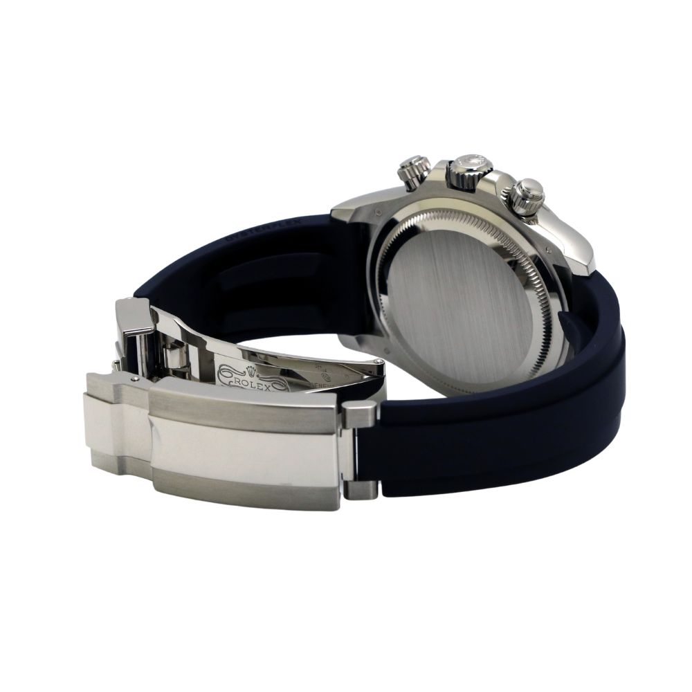 18 ct ホワイトゴールドのオイスター パーペチュアル コスモグラフ デイトナは、ブライトブラック&スチールダイアルとオイスターフレックスブレスレットを備え、ブラック セラクロムタキメーターベゼルが特徴的です。