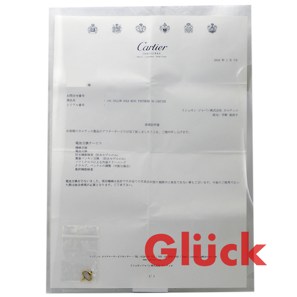 修理証明書(2016年に電池交換)と時刻調整ピンが付属いたします。