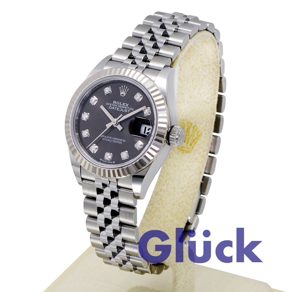 ダークグレー、ダイヤモンド入りダイアルとジュビリー(Jubilee)ブレスレットを備えた、オイスタースチール&ホワイトゴールドのオイスター パーペチュアル レディ デイトジャスト 28 279174G、入荷いたしました。