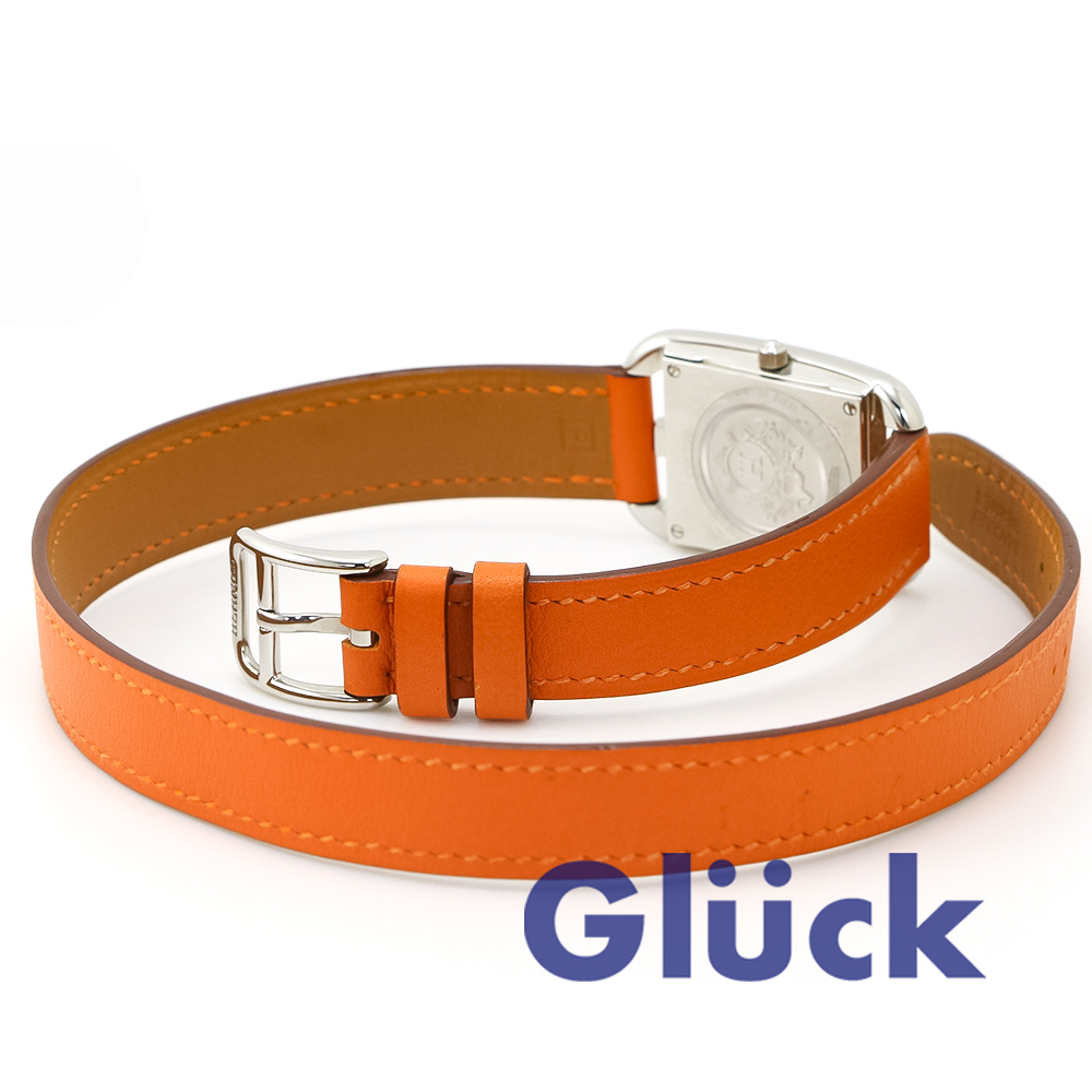 シルバーオパーリン製文字盤に、ロングサイズのオレンジカラードゥブルトゥール・レザーストラップモデルです。