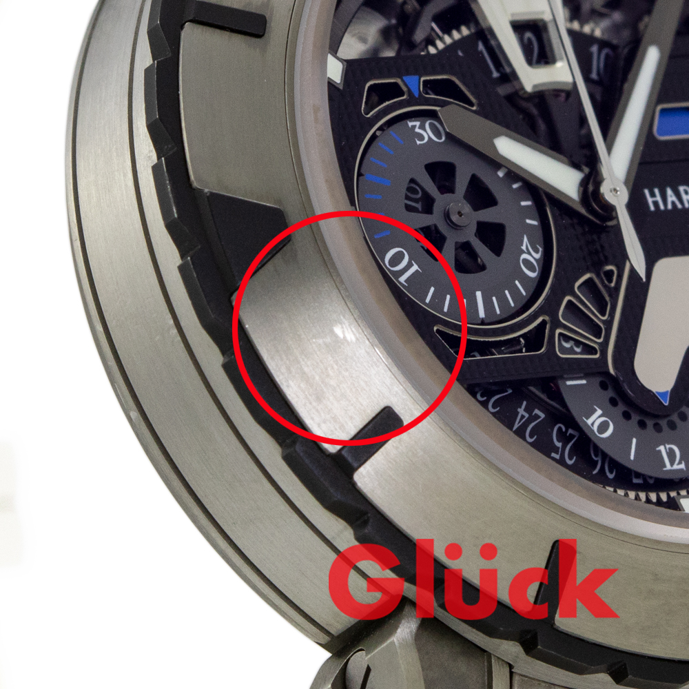 ベゼル表面に擦り傷、ケースサイド、リューズガード辺りに打痕がございます。