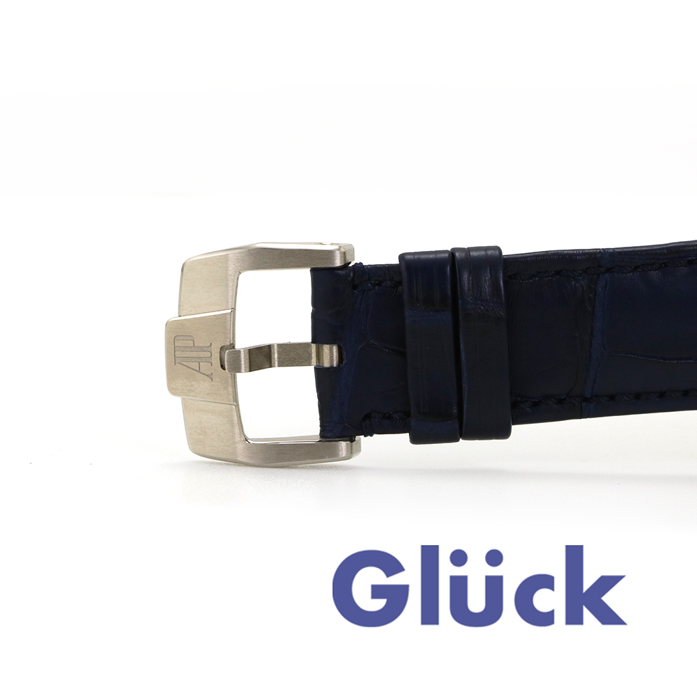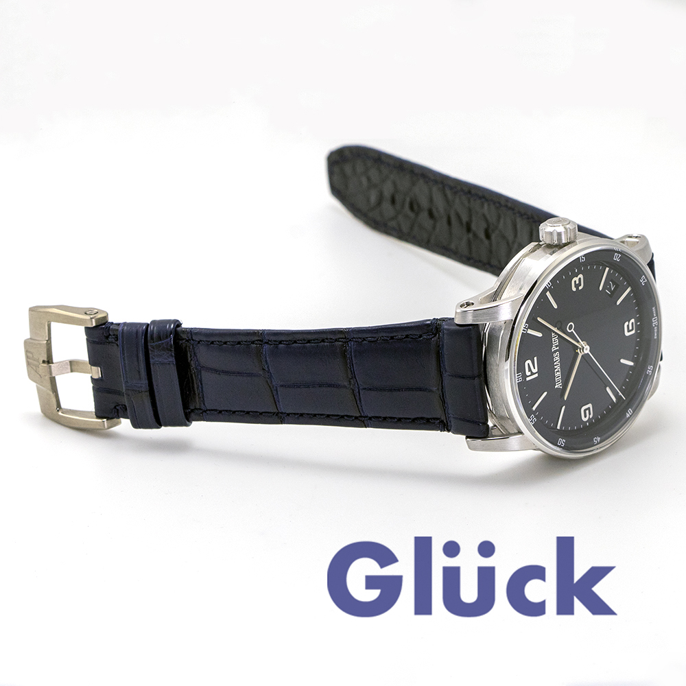 革ベルトは、「竹班入り」の両面ブルー・アリゲーター・ストラップになっております。