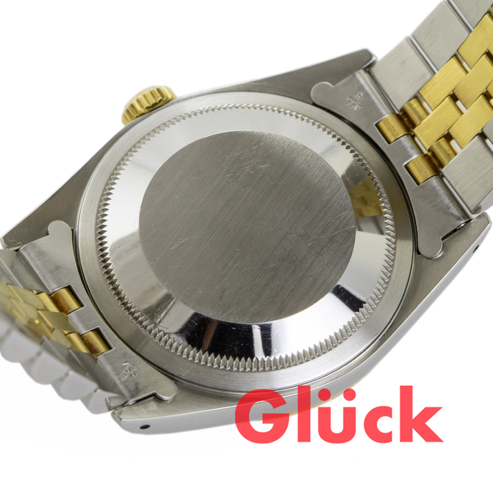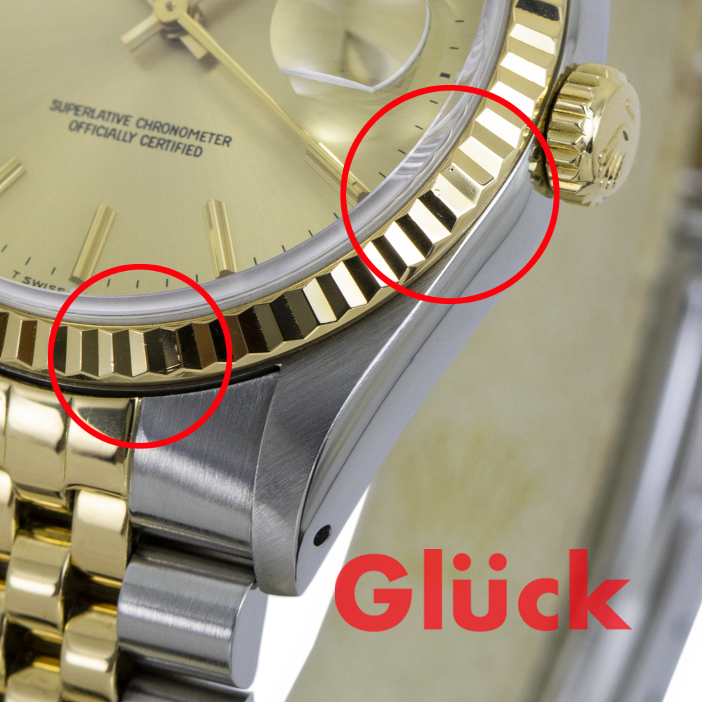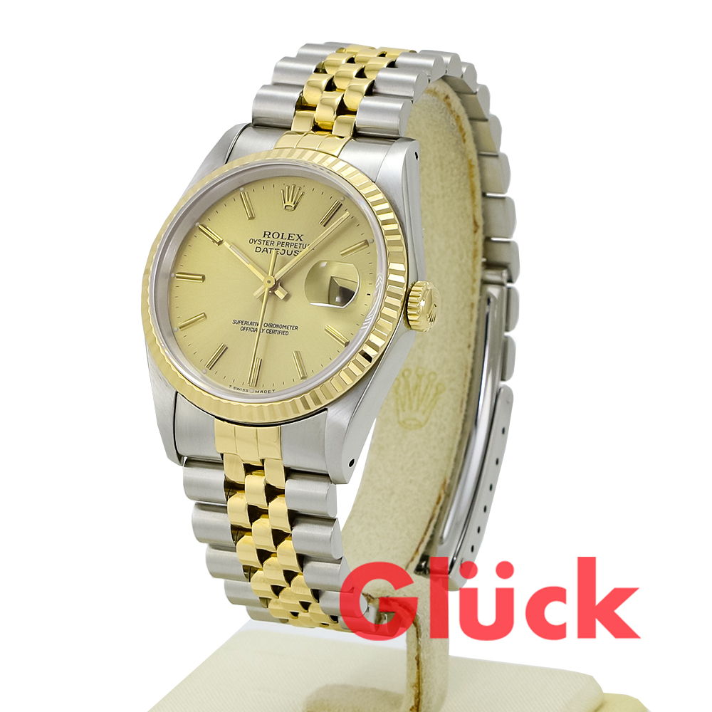 美しいカッティングが施されたフルーテッドベゼル、リューズ、ブレス中央部分には艶やかな18Kイエローゴールドが使用され、腕元を明るくゴージャスに演出してくれる人気定番モデルです。