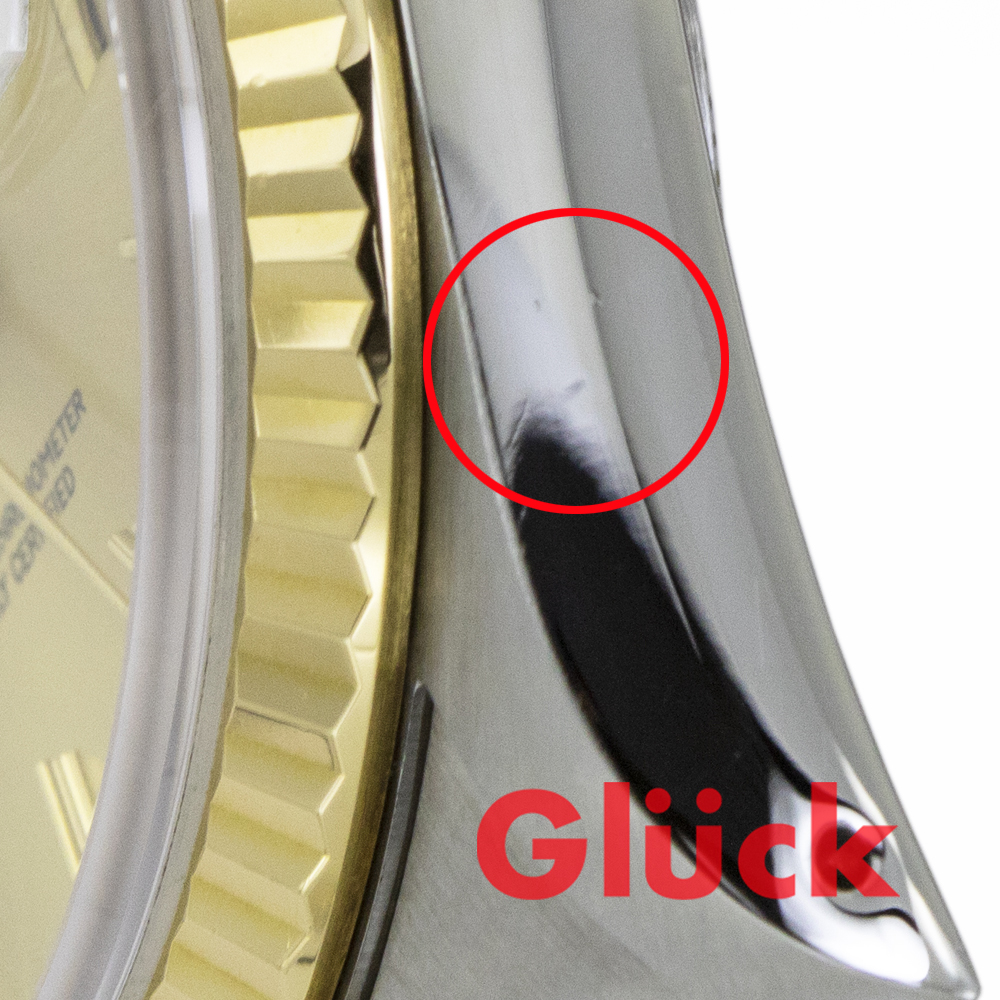 ガラス欠け、ベゼルと裏蓋にキズ、ケースサイドに磨き後があります。