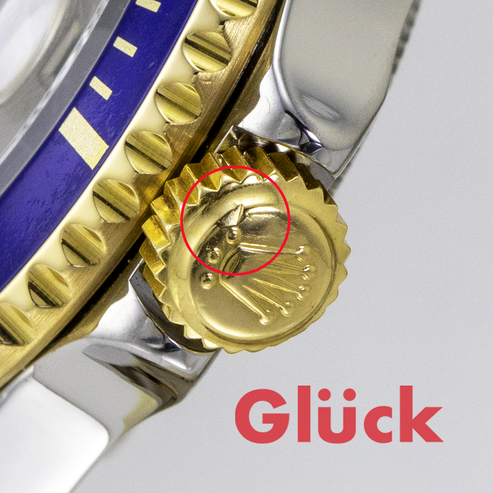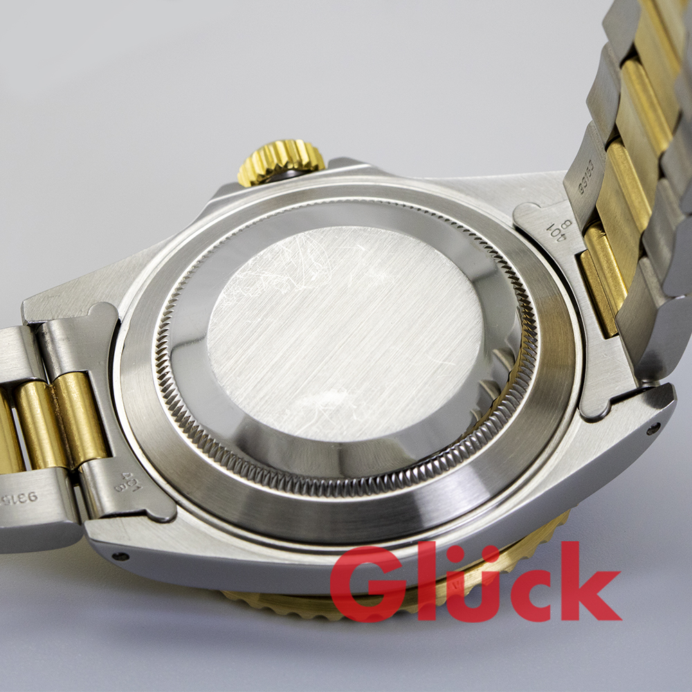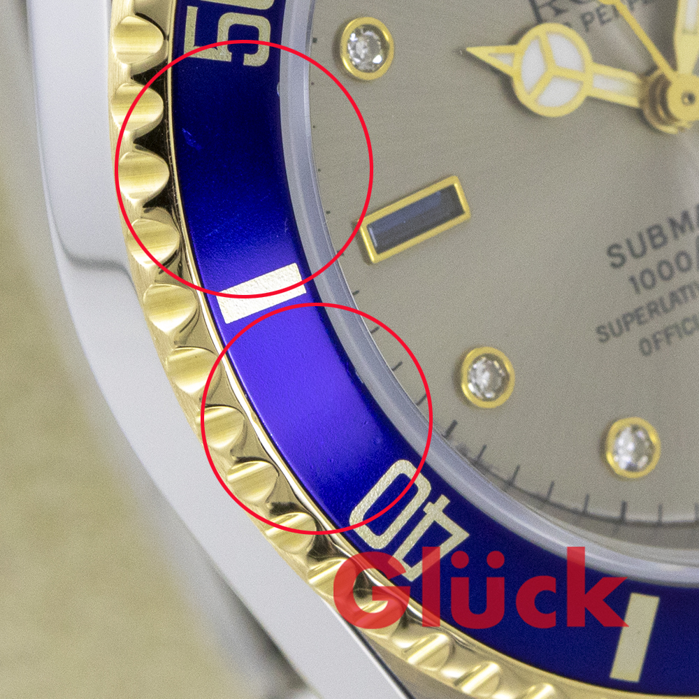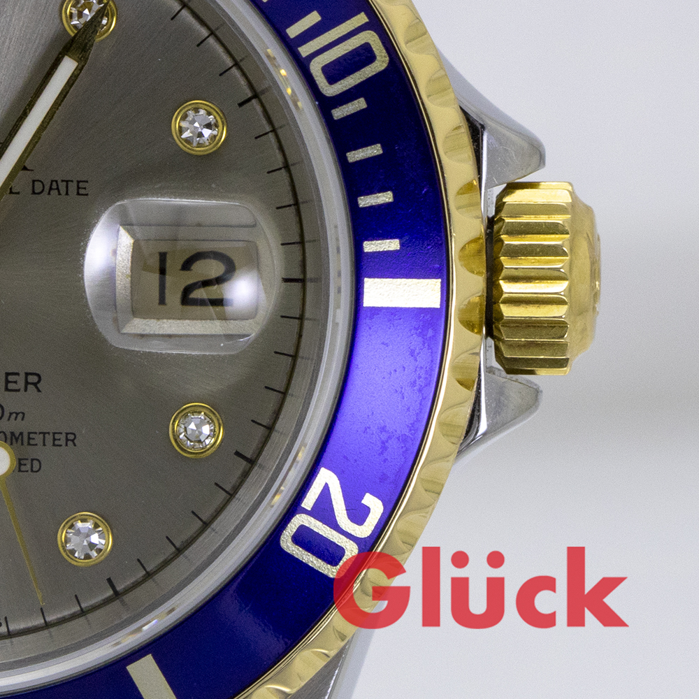 リューズに打痕、ベゼル塗料ムラ、裏蓋にスリキズなど、経年変化がみられる部分もありますが、おおむねきれいな状態です。