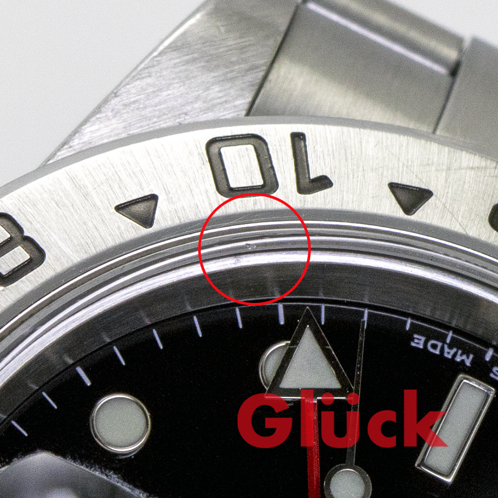 ベゼルに使用に伴うキズ、5時位置ガラス角に小欠け、7時位置ガラス表面に線キズがあります。