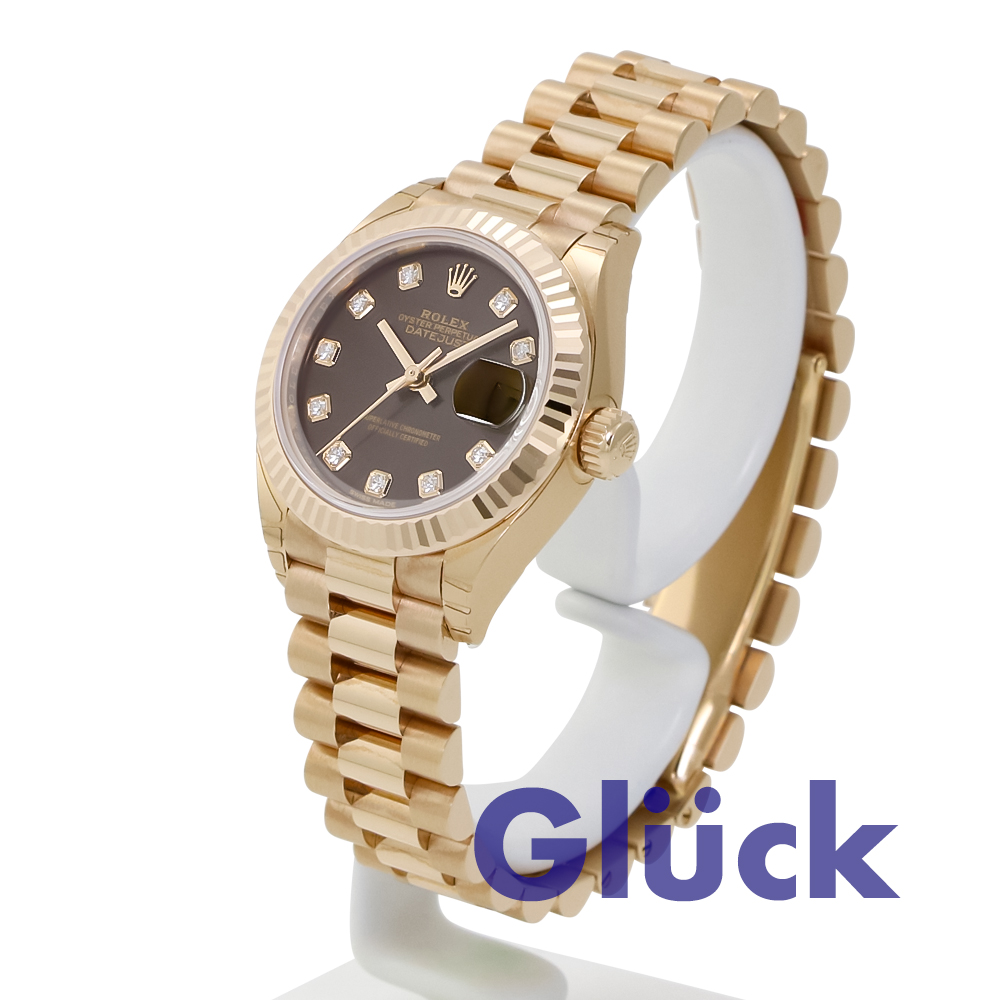 こちらは、チョコレート・10ポイントダイヤモンド入りダイアルとプレジデント(President)ブレスレットを備えたモデルです。