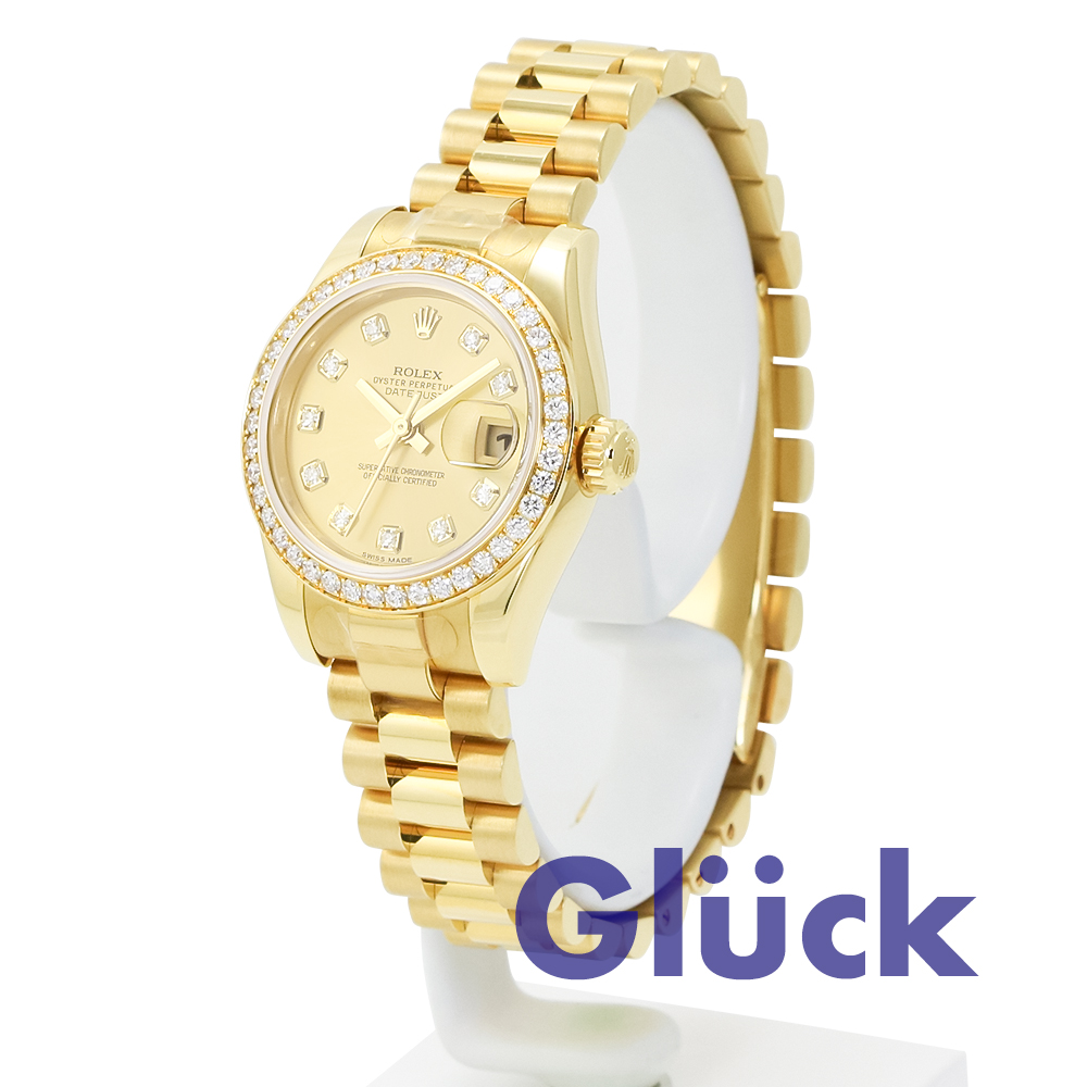 こちらはベゼルにダイヤモンドをセッティングしており、文字盤に10Pのダイヤモンドとイエローゴールドの素材を全体に使用したデイトジャストです。