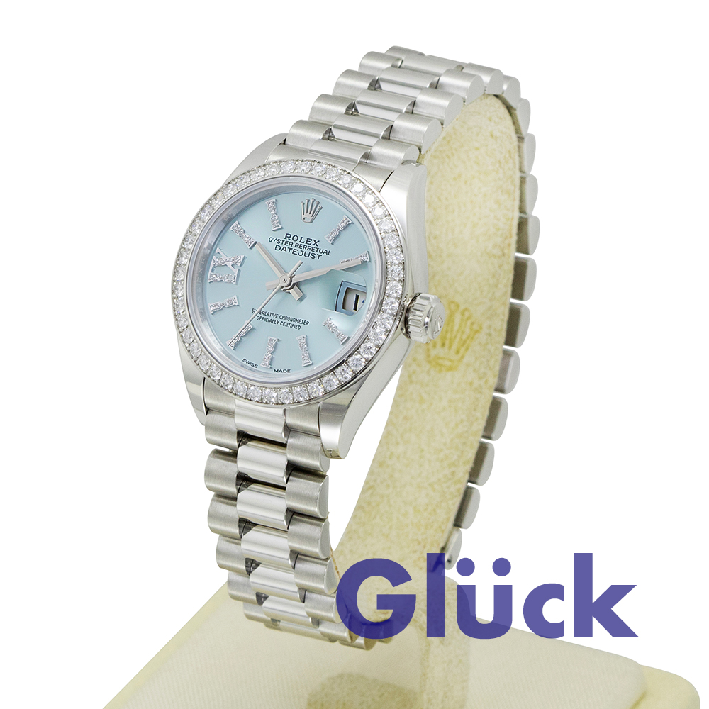 ダイヤモンド入りアイスブルーダイアルとプレジデント(President)ブレスレットを備えた、プラチナのオイスター パーペチュアル レディ デイトジャスト 28 279136RBR、入荷いたしました。