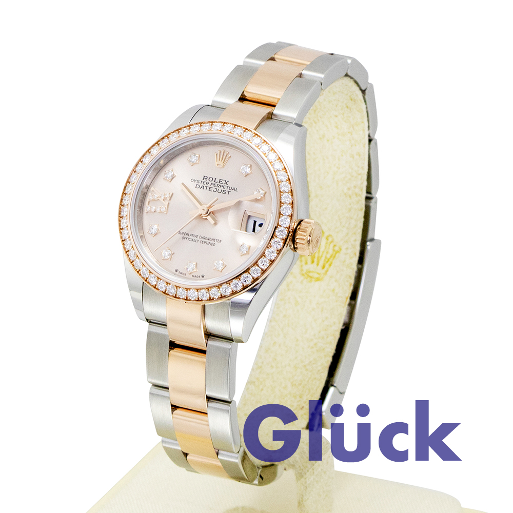 サンダストカラー、ダイヤモンド入りダイアルとオイスターブレスレットを備えた、オイスタースチール&エバーローズゴールドのオイスター パーペチュアル レディ デイトジャスト 28 279381RBR、入荷いたしました。