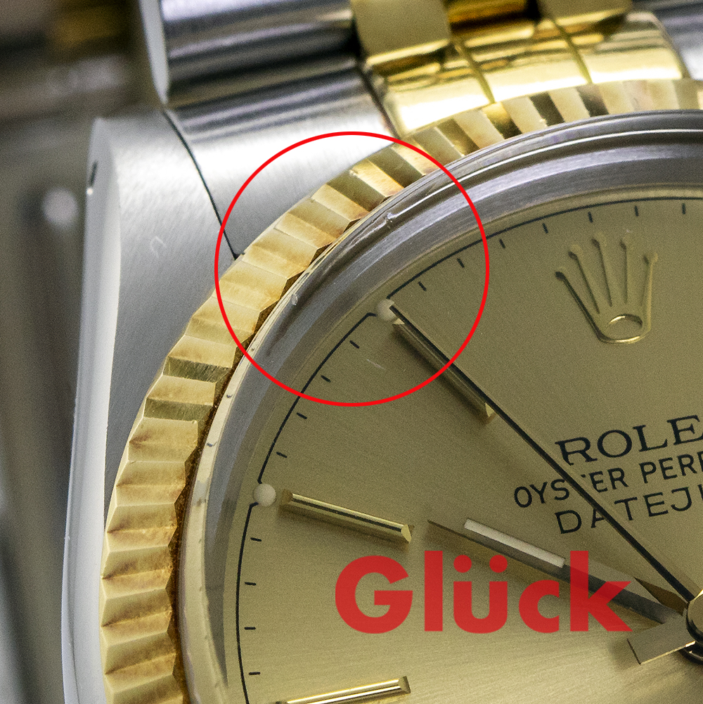 風防に欠けやキズがあり、全体的に使用に伴うキズと経年変化が見られます。