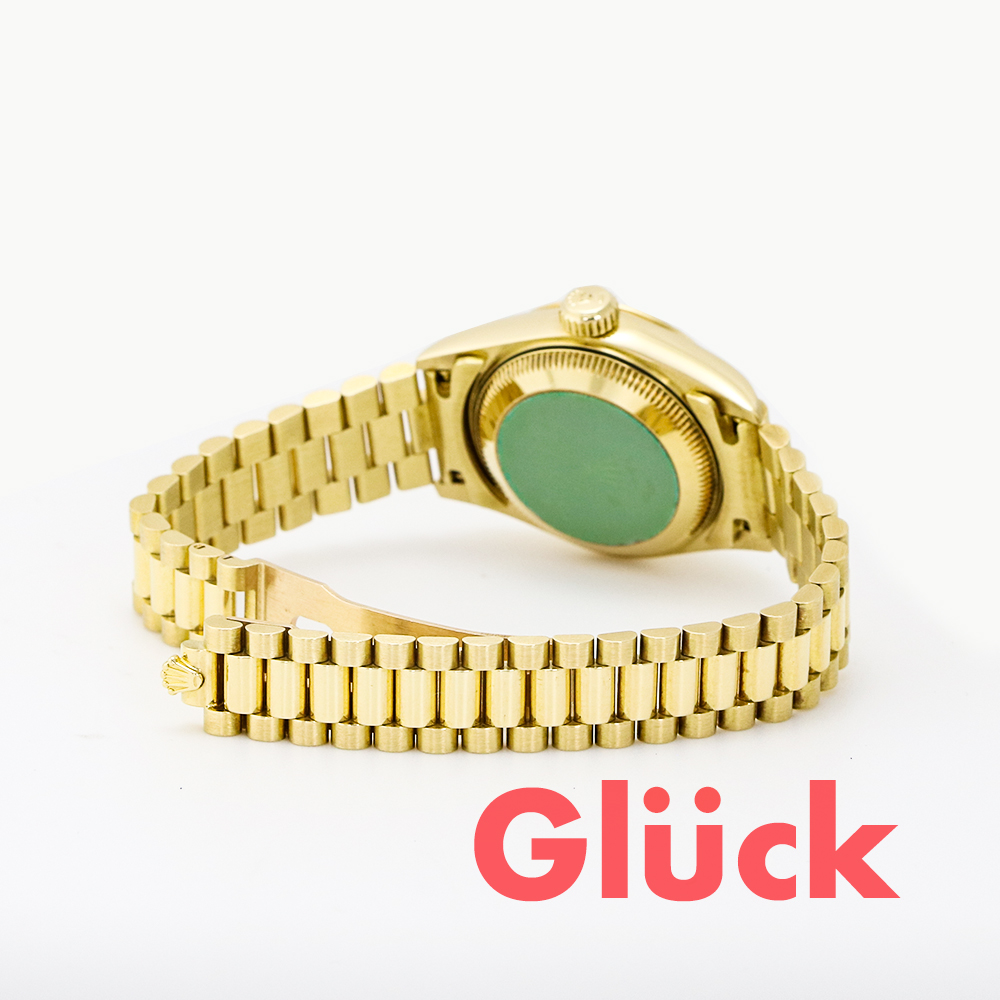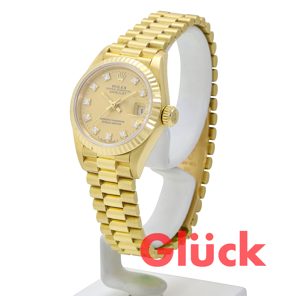 イエローゴールドの輝きとシャンパン文字盤に10Pダイヤインデックスがゴージャスな印象を与えます。