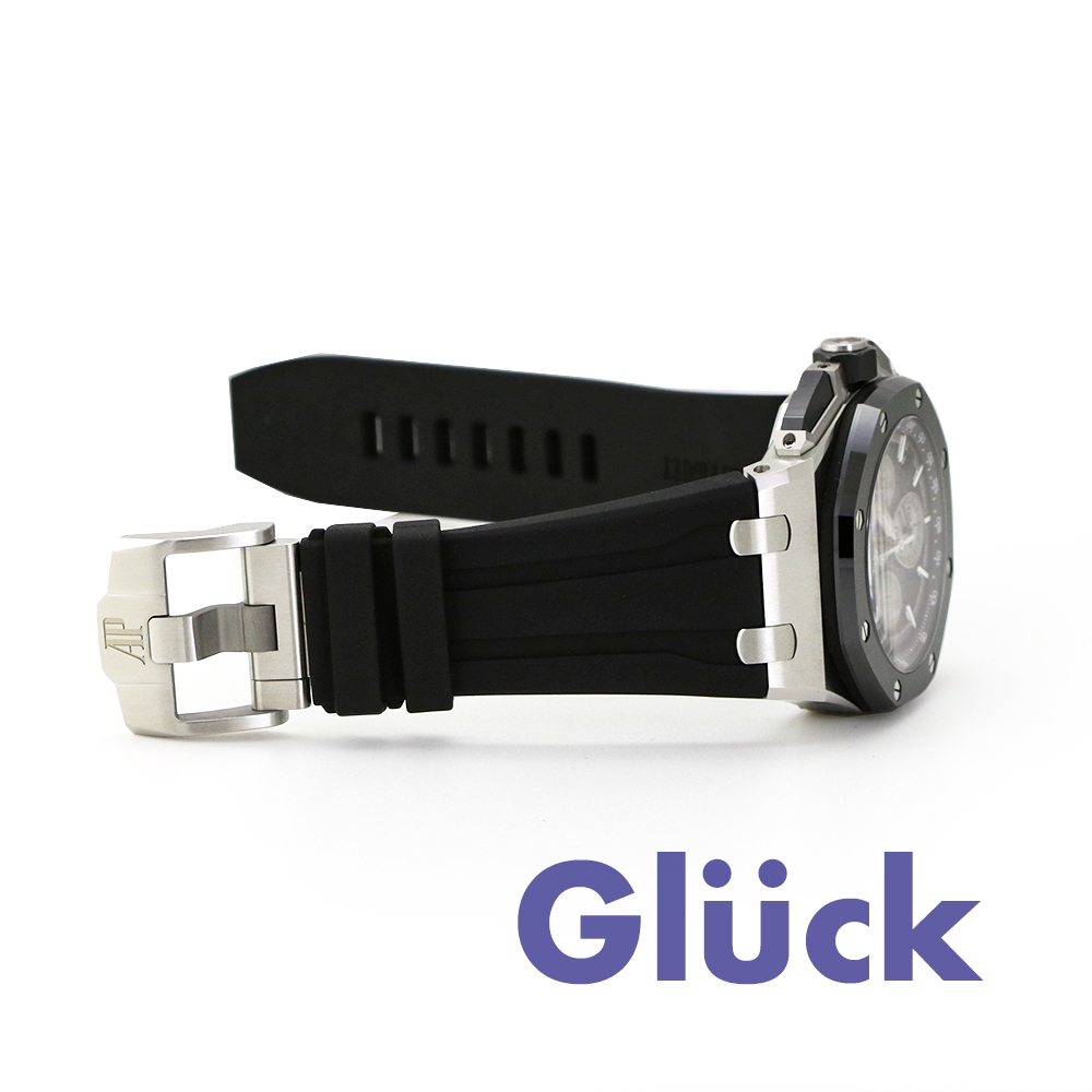 ケースは、ステンレススティールケース、反射防止加工サファイアクリスタルとシースルーバック、ブラックセラミックのベゼル、ブラックラバーストラップにステンレススティールのAPピンバックルが力強さを感じさせます。