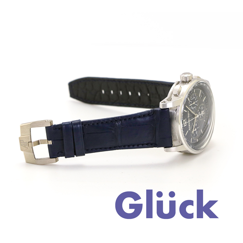 自動巻きクロノグラフのディープブルーラッカーを施した文字盤は、完璧なミラー仕上げです。