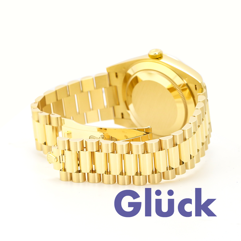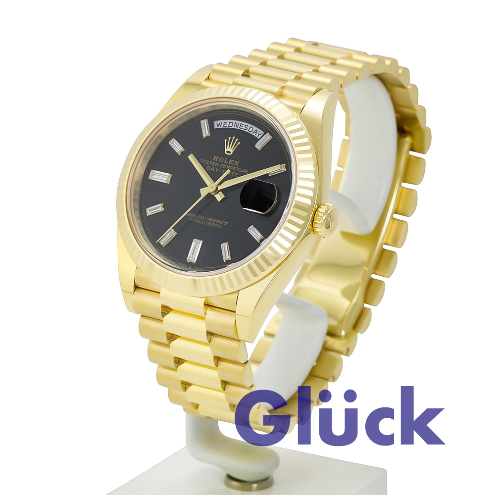 ブライトブラック、ダイヤモンド入りダイアル、フルーテッドベゼルとプレジデント(President)ブレスレットを備える18 ct イエローゴールドのオイスター パーペチュアル デイデイト 40、Ref:228238Aが入荷いたしました。