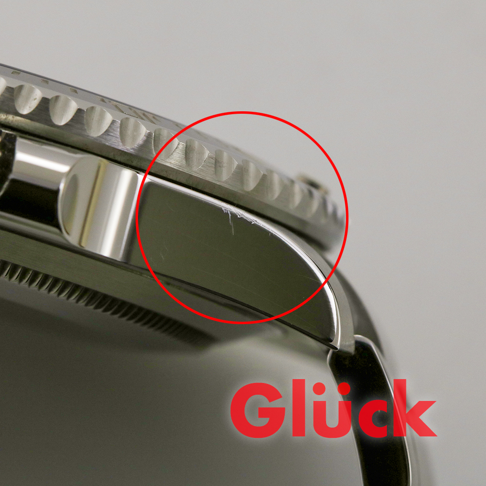 ケースサイド、裏蓋、バックル表面にキズと25min側ラグ縁に打痕がございますが、全体的に良い状態です。