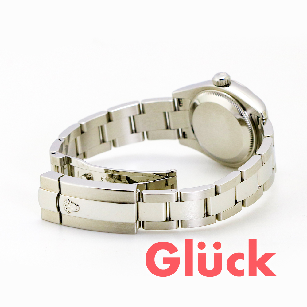ホワイト文字盤にエレガントなローマ数字を配置し、ポリッシュ仕上げが施されたドームベゼルと、オイスターブレスレットのモデルです。