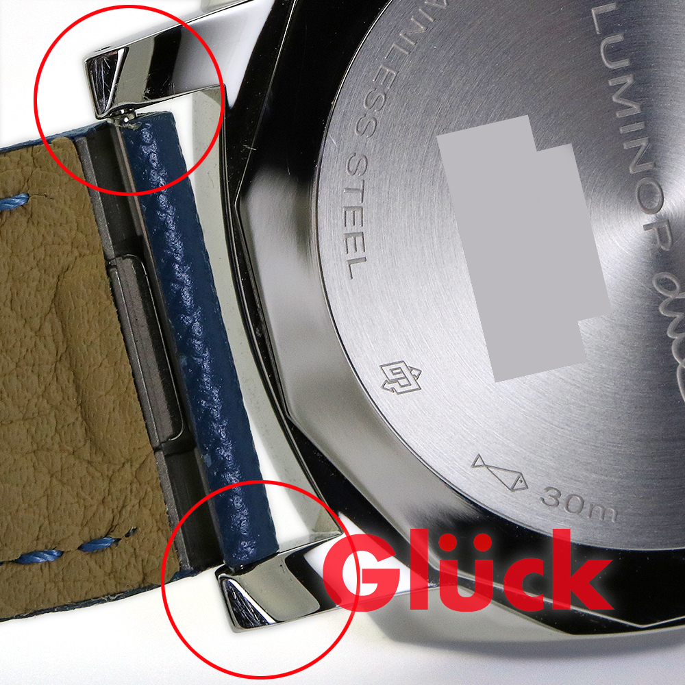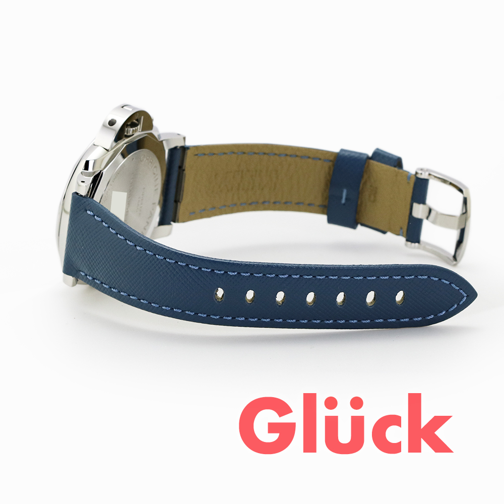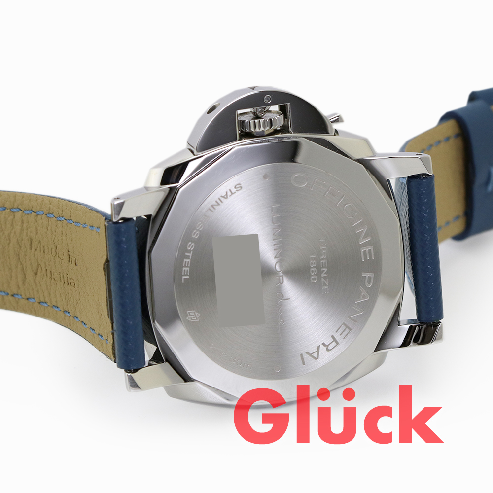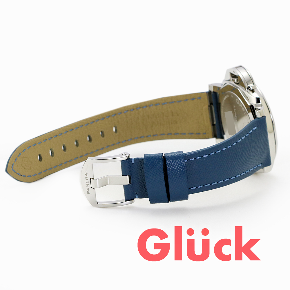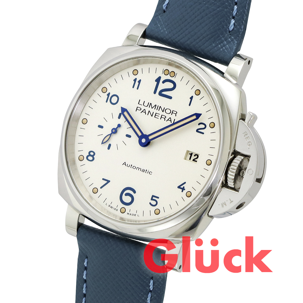 アイボリーの文字盤にはパネライの伝統的なデザインが施されており、夜光ドットインデックスと針と同色の大型のブルーの数字があしらわれています。