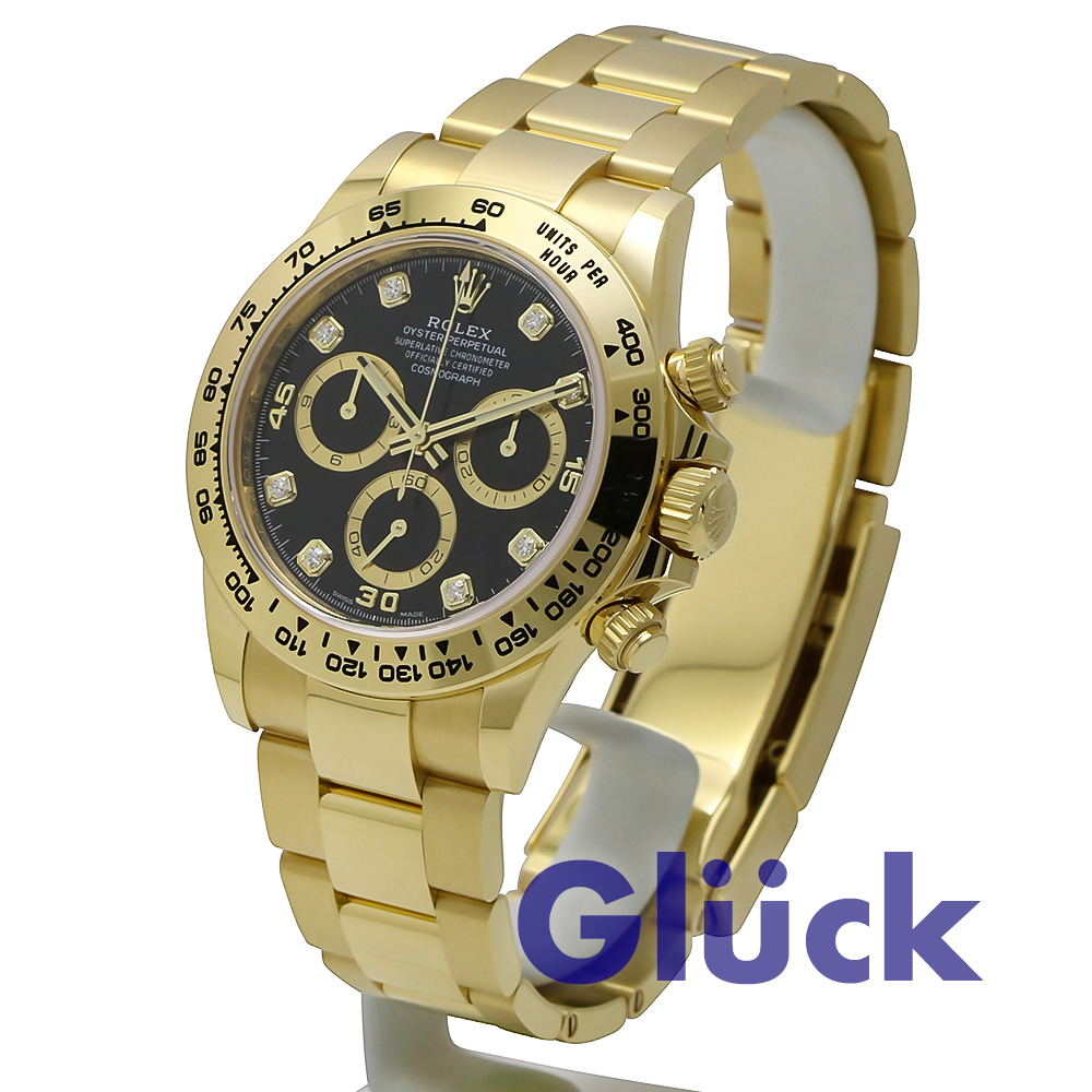 ダイヤモンド入りのブラックダイアルとオイスターブレスレットを備えた、18 ct イエローゴールドのオイスター パーペチュアル コスモグラフ デイトナ 116508G、入荷いたしました。