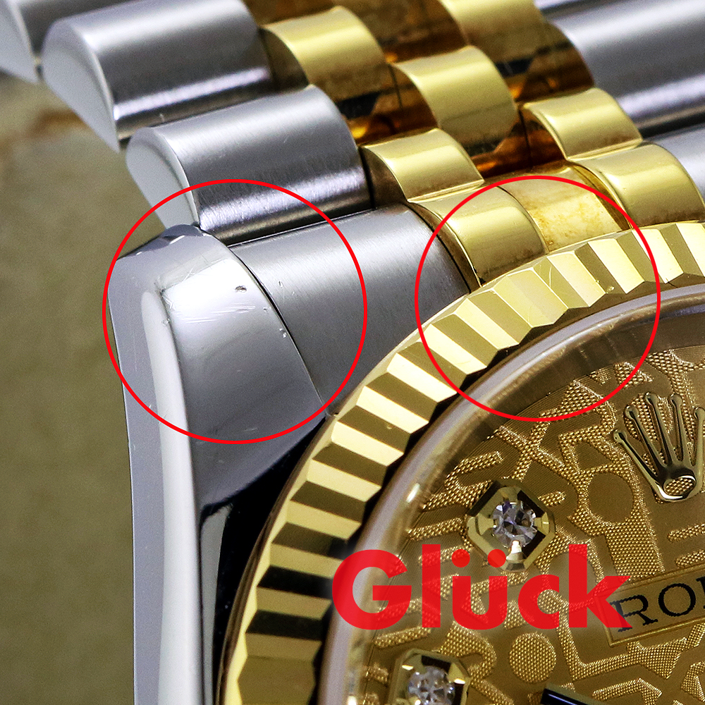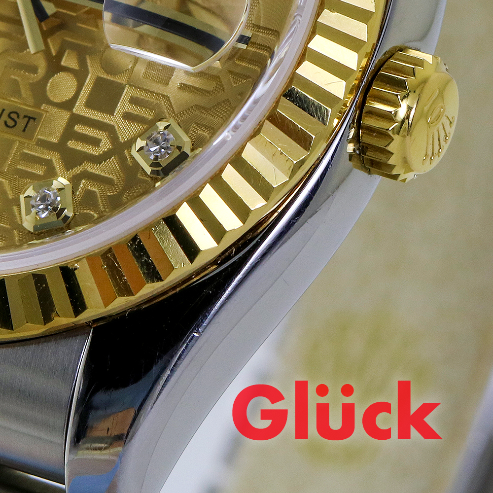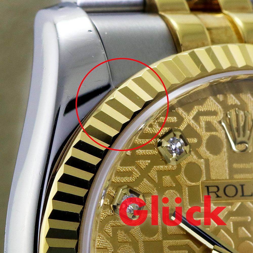シャンパン文字盤の全面に「ROLEX」と彫りが刻まれた、10ポイントダイヤのモデルです。