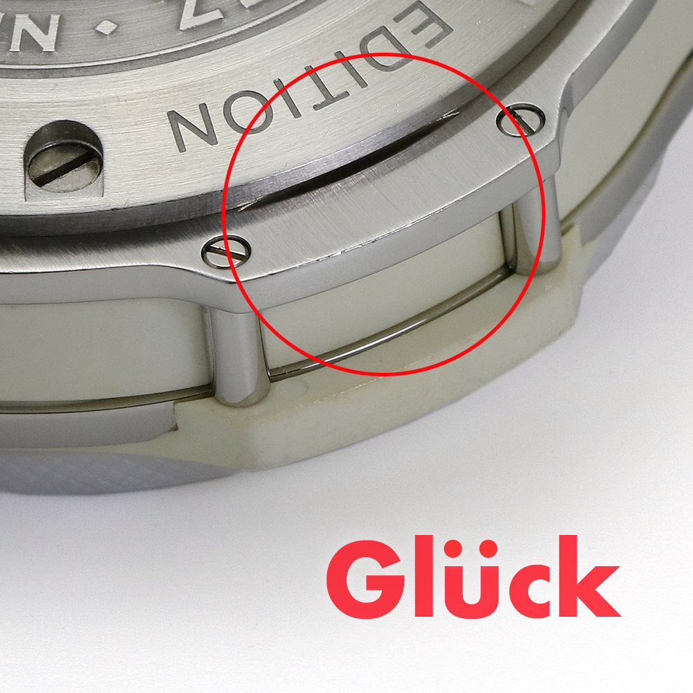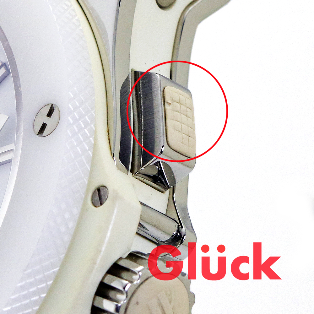 クロノグラフボタンのラバー部分に小さな欠け、全体的に使用に伴うキズがあります。