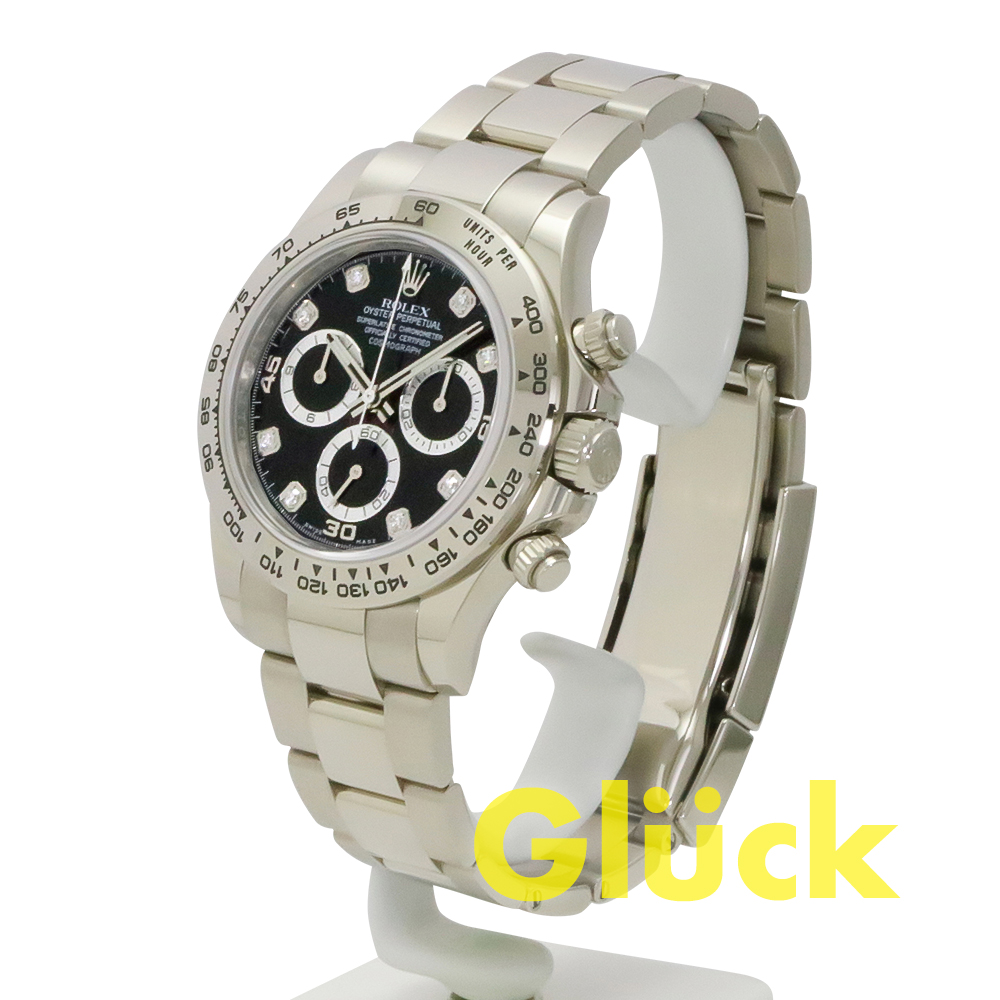 18 ct ホワイトゴールドタキメーターベゼルが特徴的である、ダイヤモンド入りのブラックダイアルとオイスターブレスレットを備えた18 ct ホワイトゴールドのオイスター パーペチュアル コスモグラフ デイトナ、Ref:116509G、入荷いたしました。