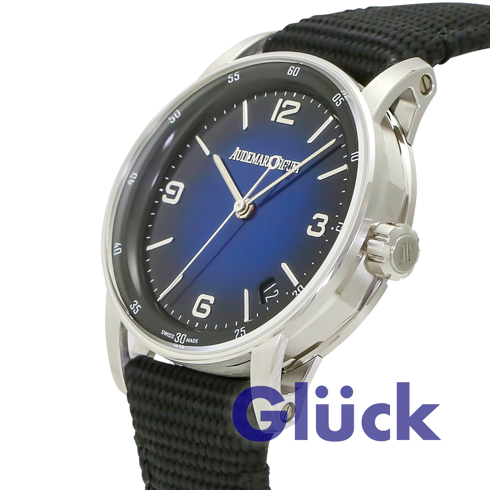 18Kホワイトゴールドケースに、サンバースト模様のスモークブルーラッカーダイヤル、ダイヤルの深みのあるカラーにマッチしたブラックラバーストラップモデルです。