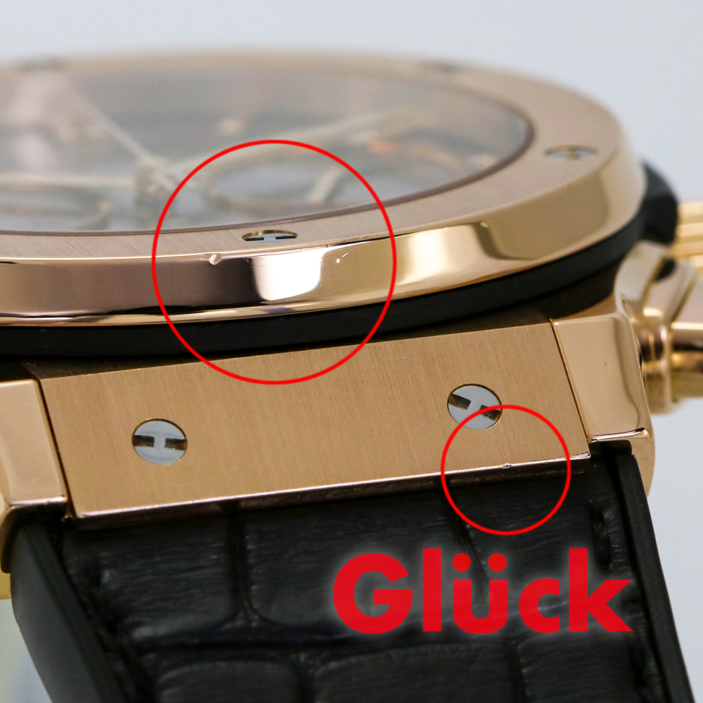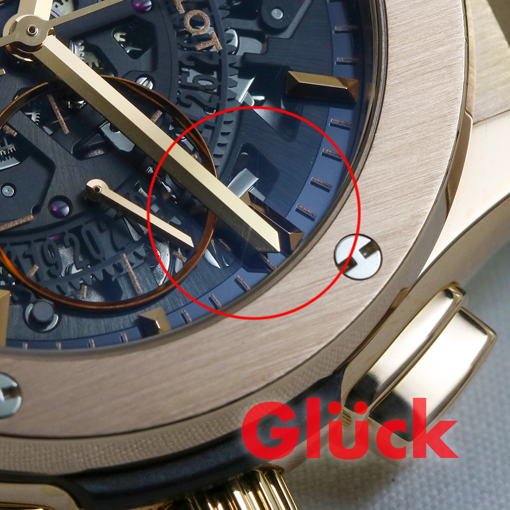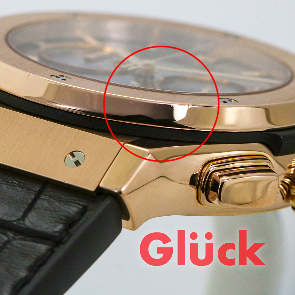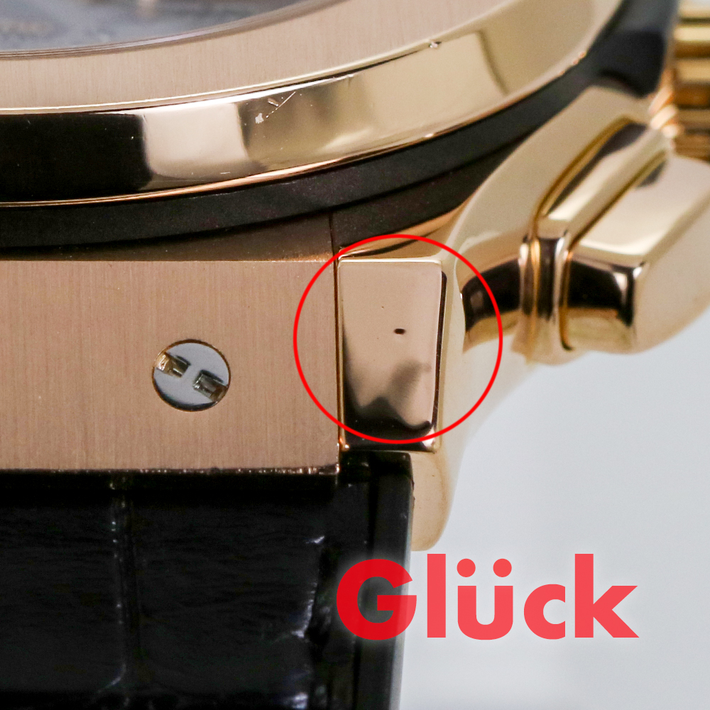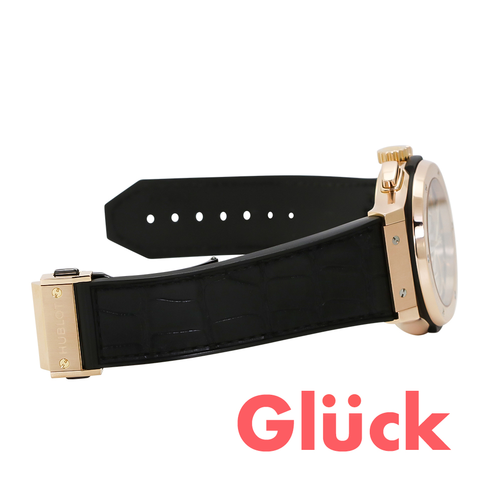 ウブロがキングゴールドと名づけたゴールドをケース素材に採用しており、通常のピンクゴールドに比べ、経年変化による退色がしにくくなっています。