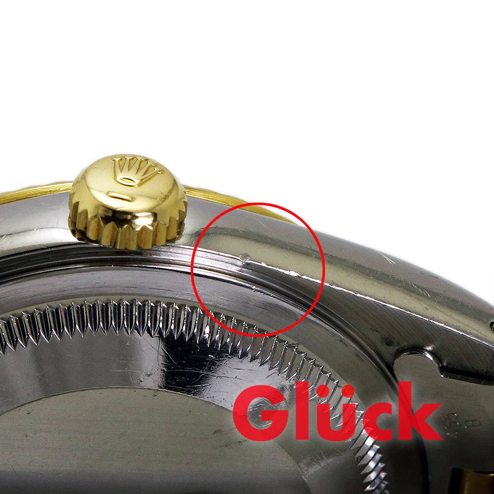 ガラス角に欠け、全体的に使用に伴うキズや打痕と経年変化、ブレスに伸びが見られます。