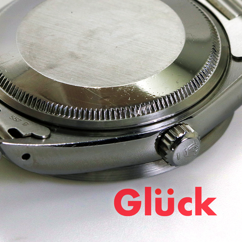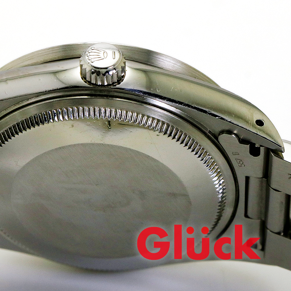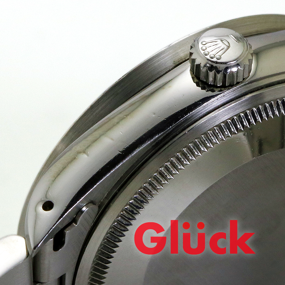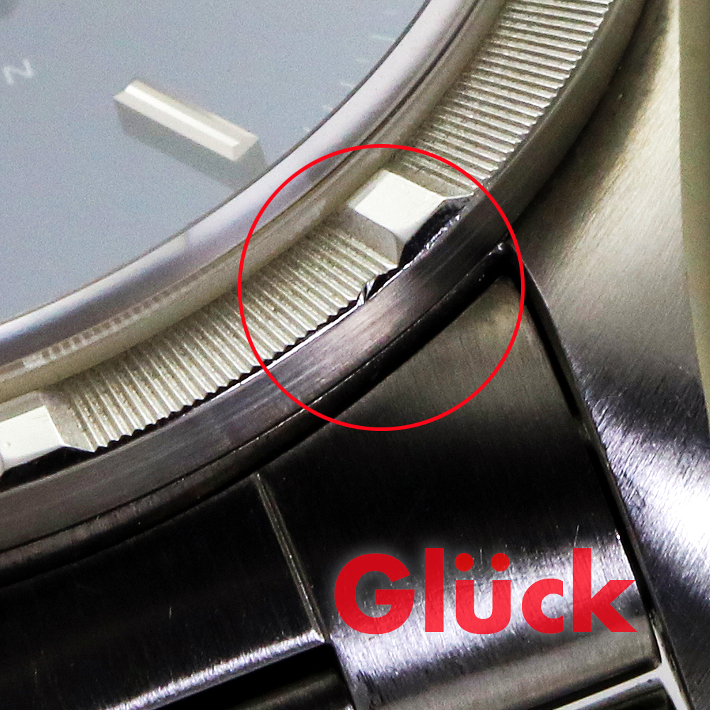 エンジンターンドベゼルと呼ばれるベゼルは、全体に光沢がない加工で、5分刻みに鏡面仕上げのデザインとなっており、12時位置のみ鏡面部分が2つ並んでいます。