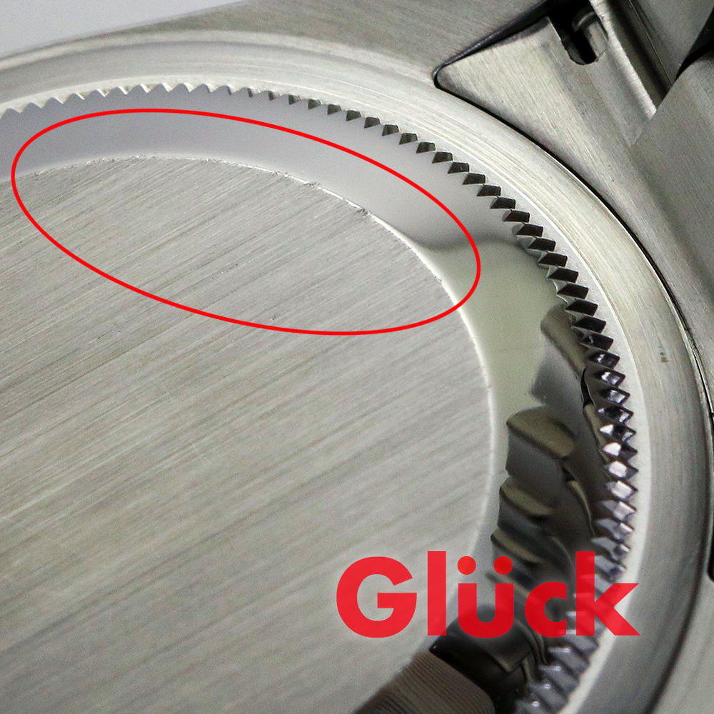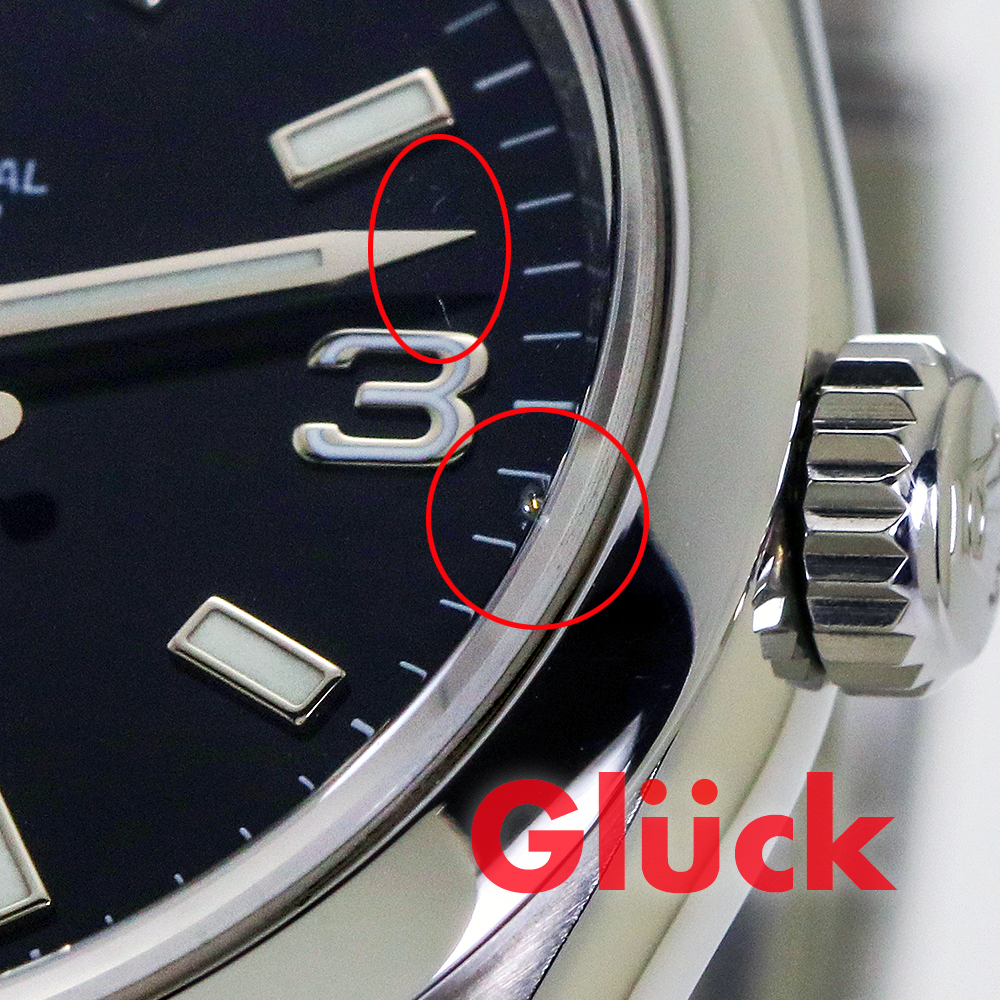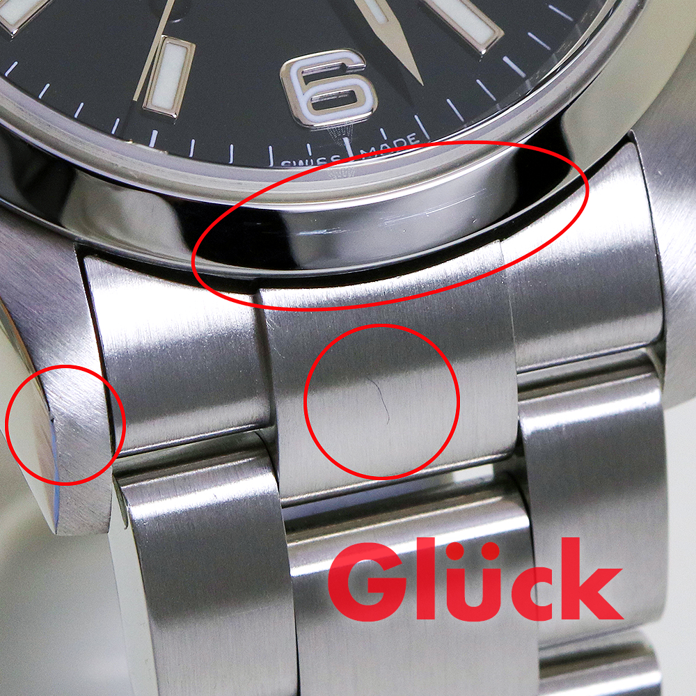 6時位置のベゼルに打痕と線キズ、ブレスコマ中央に線キズ、7時位置ラグに打痕があります。