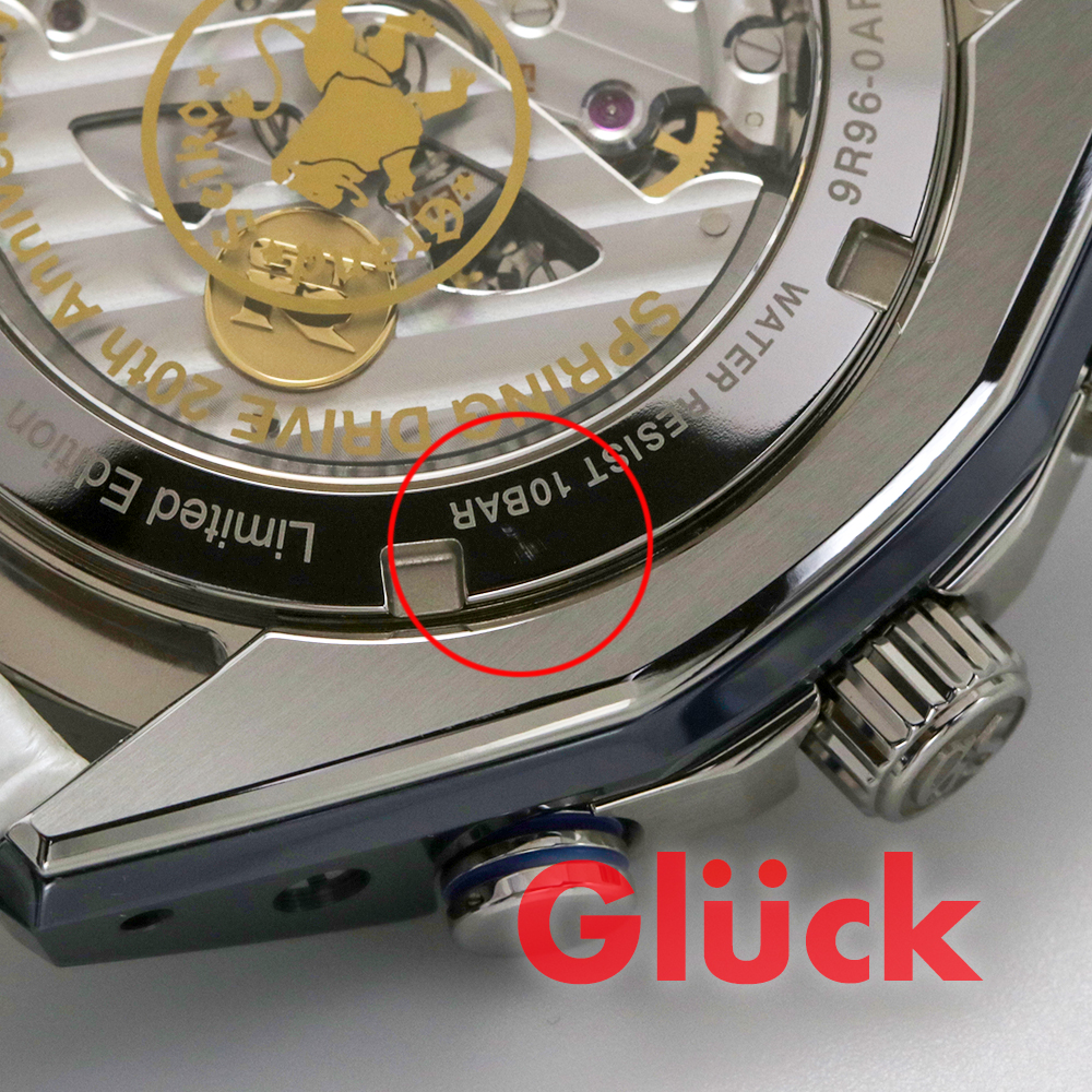 スプリングドライブムーブメントは、サファイアクリスタルのケースバックから見ることができ、K18イエローゴールドのGT-Rアニバーサリーエンブレムは振動する重量にセットされております。