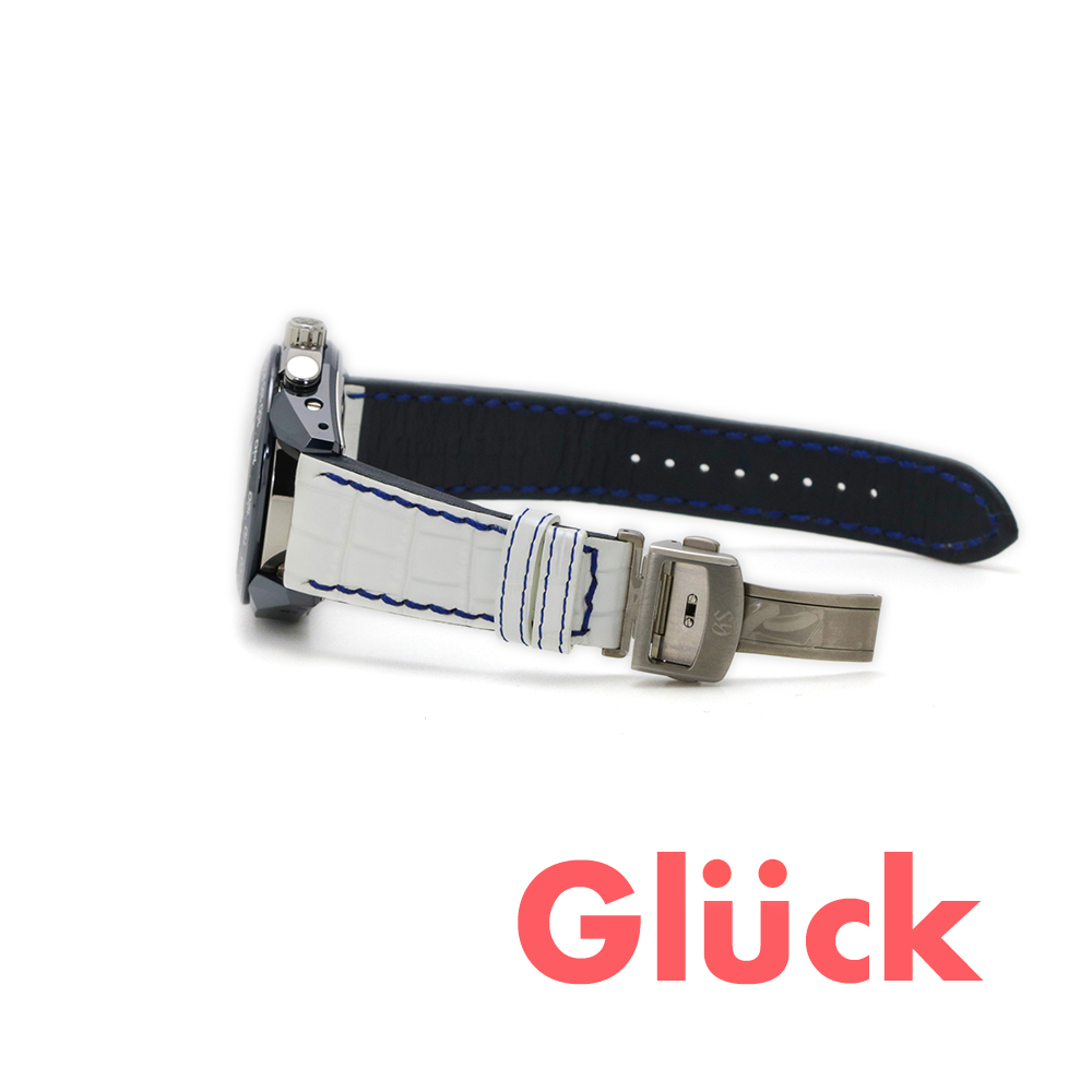 独特の白いストライプの日産レーシングカラーリングは、白いクロコダイルストラップとダイヤルのシルバーホワイトカラーに反映され、セラミックケースの青と完璧な美的調和を作り出しています。
