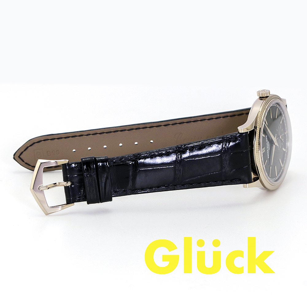 ファセット仕上げのゴールド植字インデックスとドフィーヌ型時・分針が、文字盤にエレガントで時を超越した美しさを与えています。