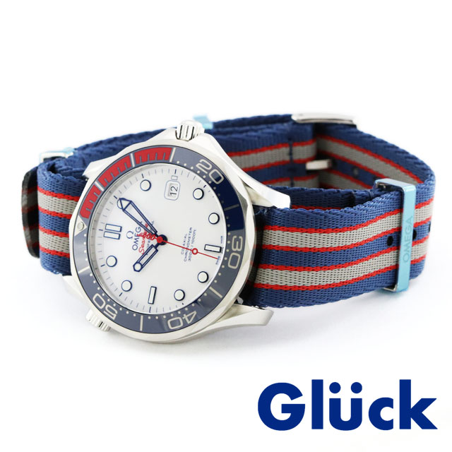 ケースや文字盤、NATOストラップには英国海軍のシンボルカラーのホワイト・ブルー・レッドが使用されており、赤い秒針には007のロゴがあしらわれており、カレンダーも「7」だけが赤色で表示され、シースルーのケースバックからは9mm弾からデザインされた特別仕様のローターがご覧になることが可能です。