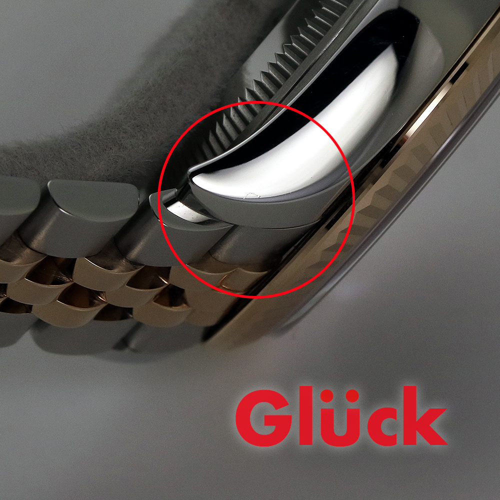 ケースサイドとラグに光が反射し、 フルーテッドベゼルを搭載した 28mmのオイスターケースのエレガントな輪郭を際立たせています。