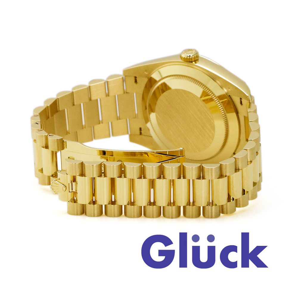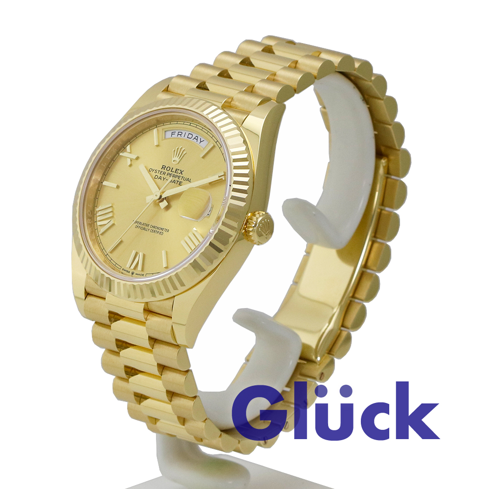 シャンパンカラーダイアル、フルーテッドベゼルとプレジデント(President)ブレスレットを備える18 ct イエローゴールドのオイスター パーペチュアル デイデイト 40、Ref:228238が入荷いたしました。