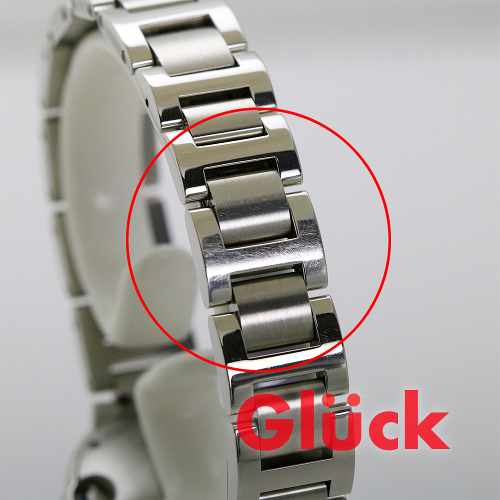 ガラスに欠けと裏蓋とブレスレットに使用に伴うキズや打痕があります。