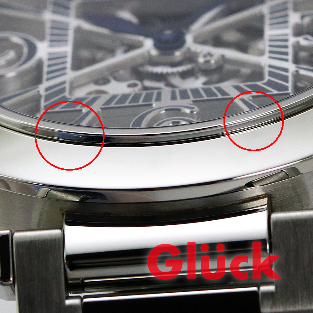 ラウンド型の防水ケース、4つのアラビア数字、ミニチェーンでケースに固定したねじ込み式リューズ プロテクター、剣型針、個性的なデザインがエレガンスと力強さを演出します。
