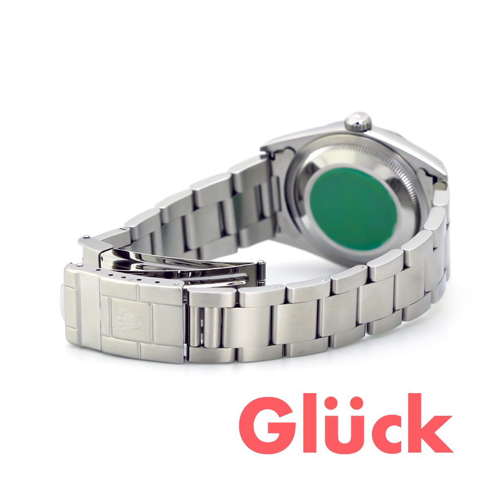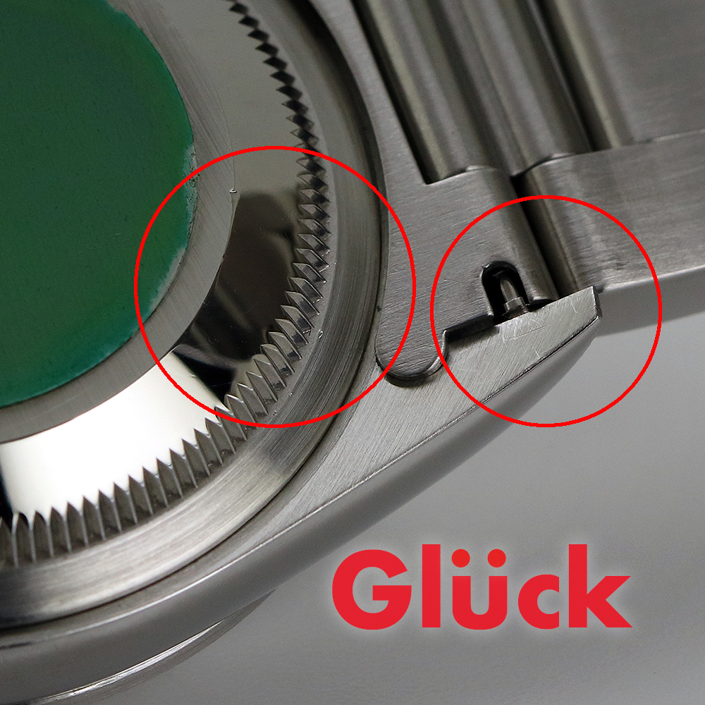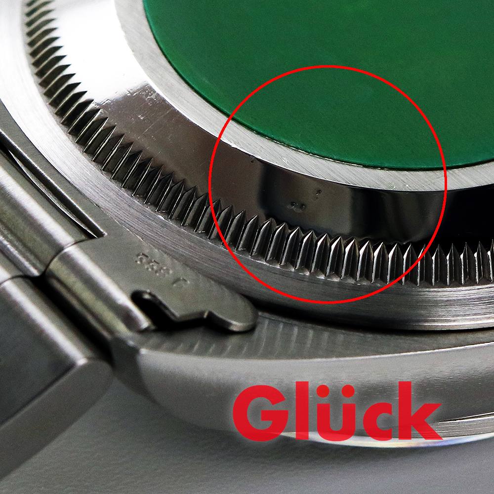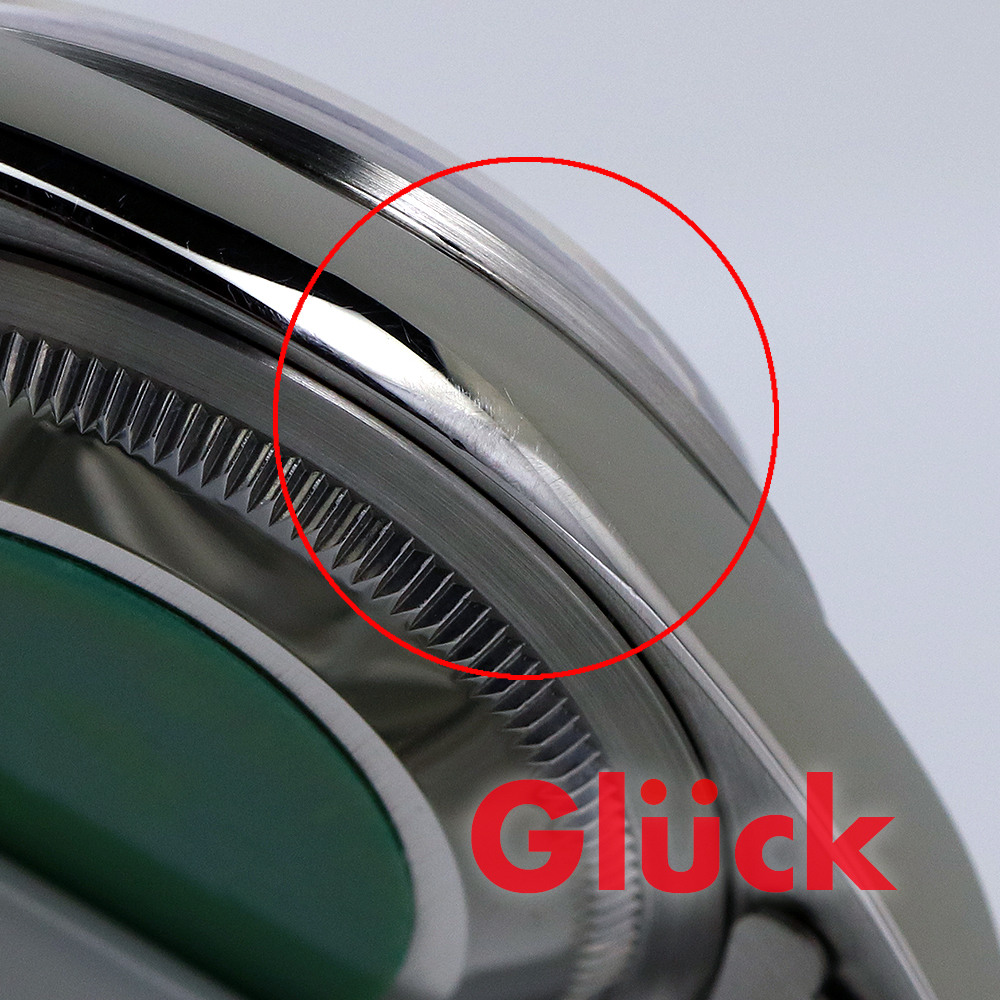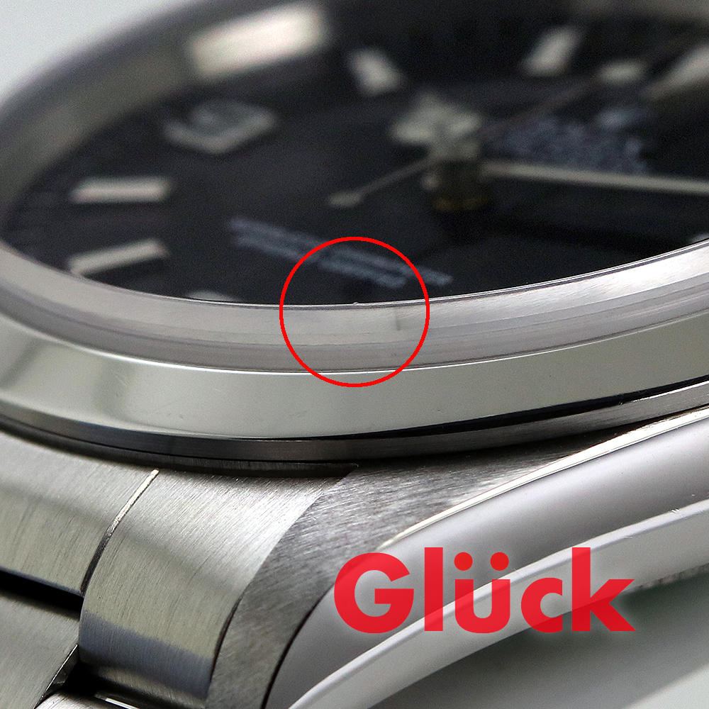メタルの縁取りが施された"369"のインデックスには、夜光塗料は塗られずに、内側に白いラインが入っています。