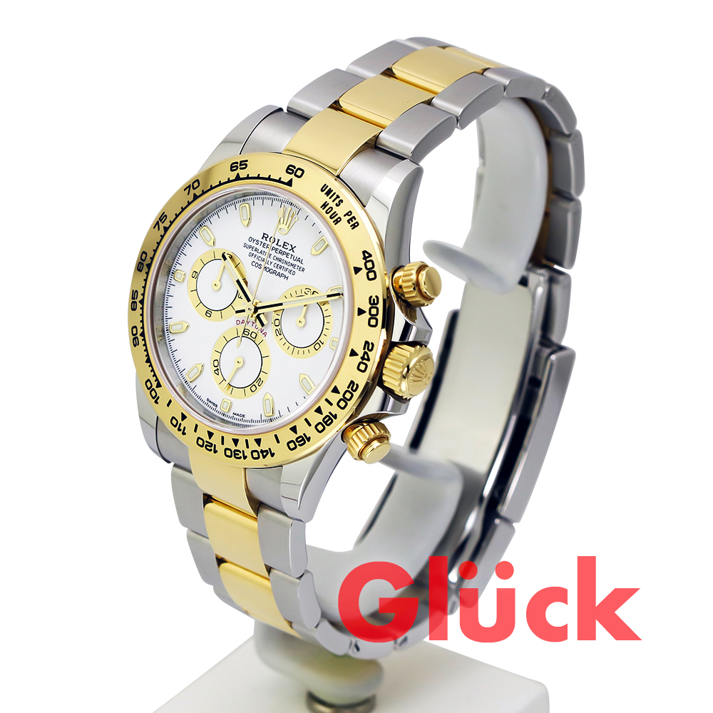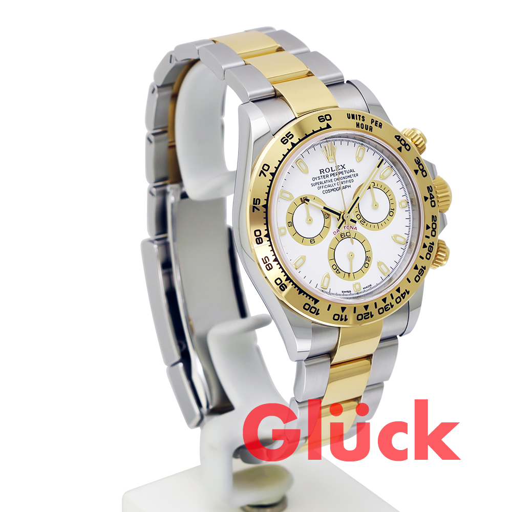 オイスタースチール&イエローゴールドのオイスター パーペチュアル コスモグラフ デイトナは、ホワイトダイアルとオイスターブレスレットを備え、イエローゴールドタキメーターベゼルが特徴的なモデルです。