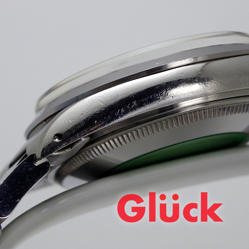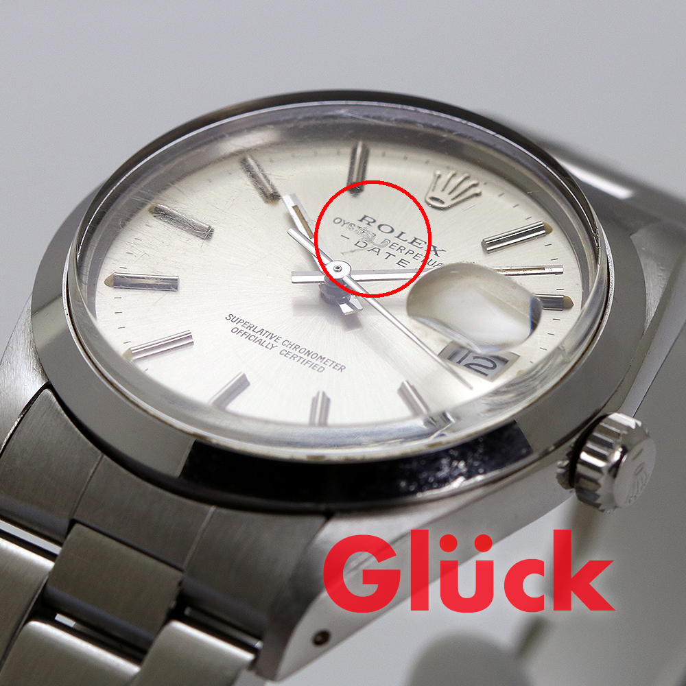 風防にキズ、全体的に使用に伴うキズや打痕、インデックスや針に経年変化が見られます。
