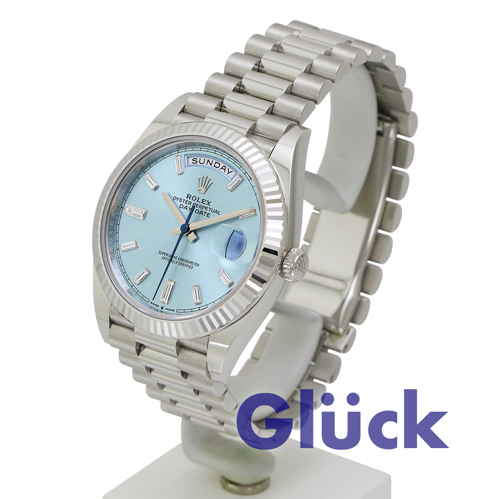 アイスブルー、ダイヤモンド入りダイアル、フルーテッドベゼルとプレジデント(President)ブレスレットを備えた、プラチナのオイスター パーペチュアル デイデイトです。