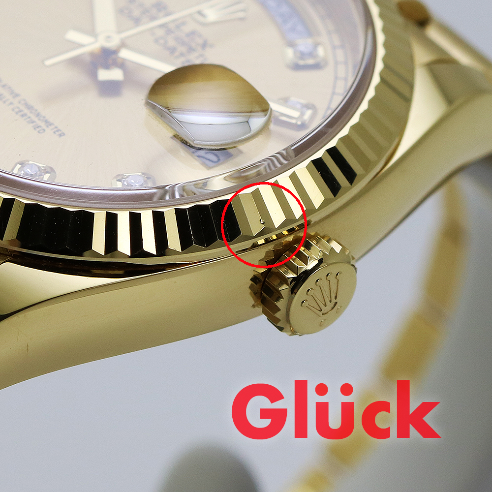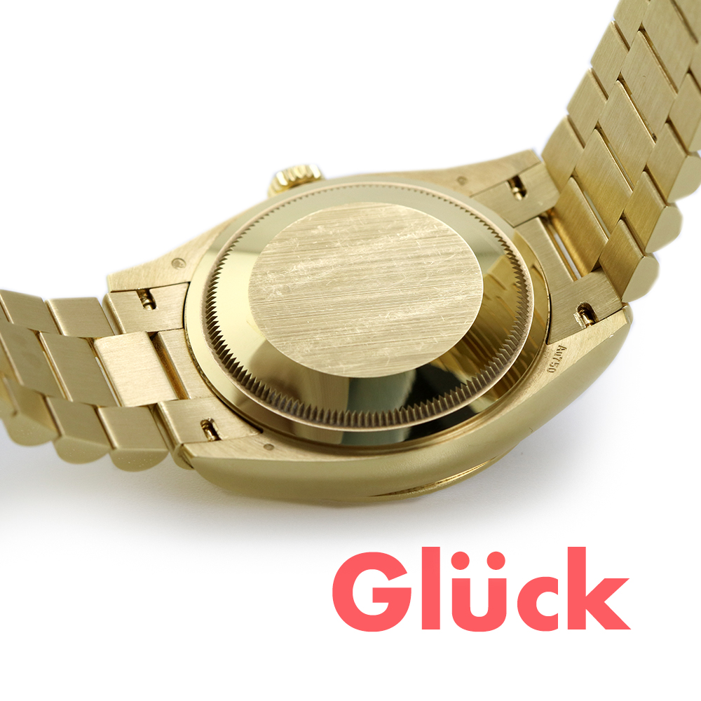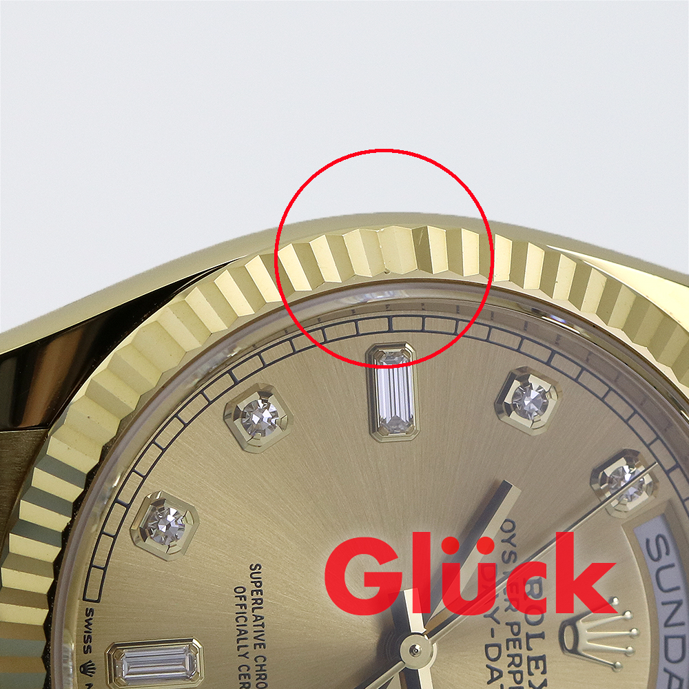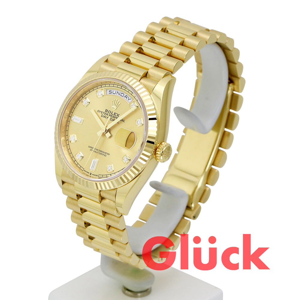 18ctイエローゴールドのオイスター パーペチュアル デイデイト 36は、シャンパンカラー、ダイヤモンド入りダイアル、フルーテッドベゼルとプレジデント(President)ブレスレットを備えています。