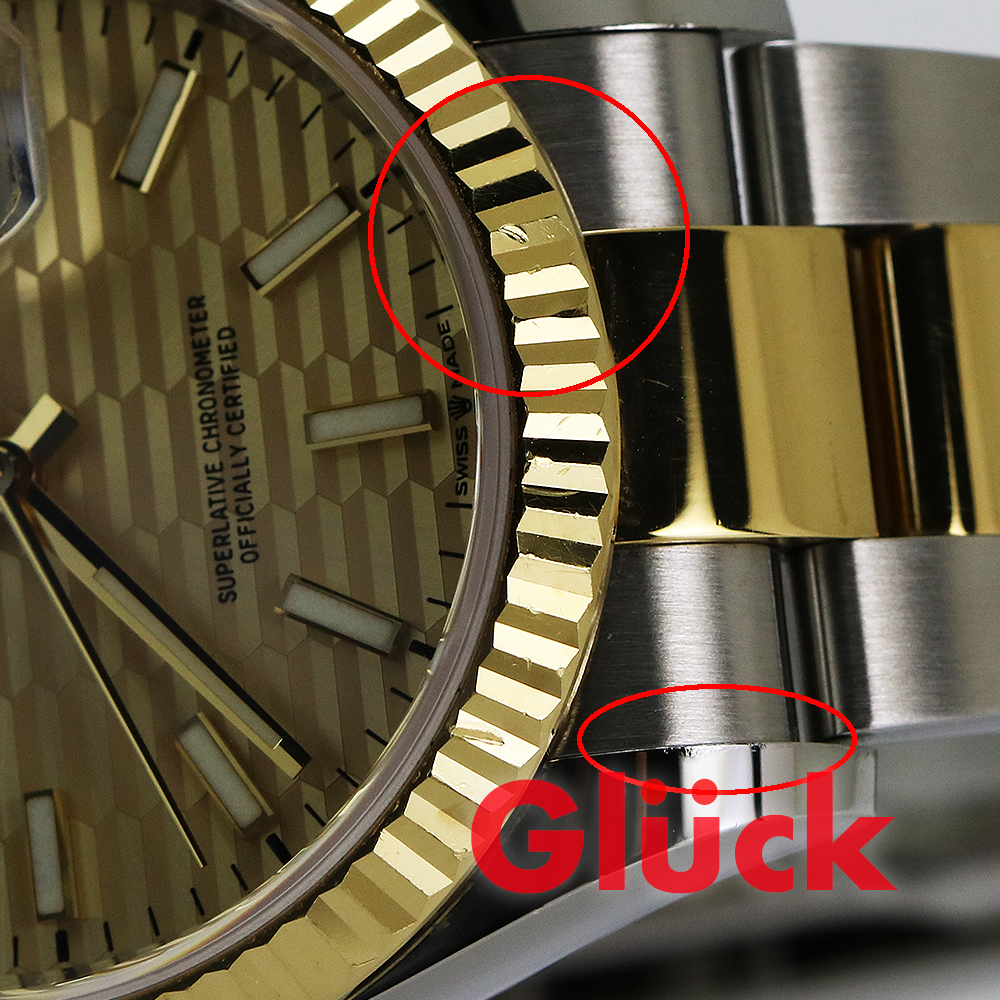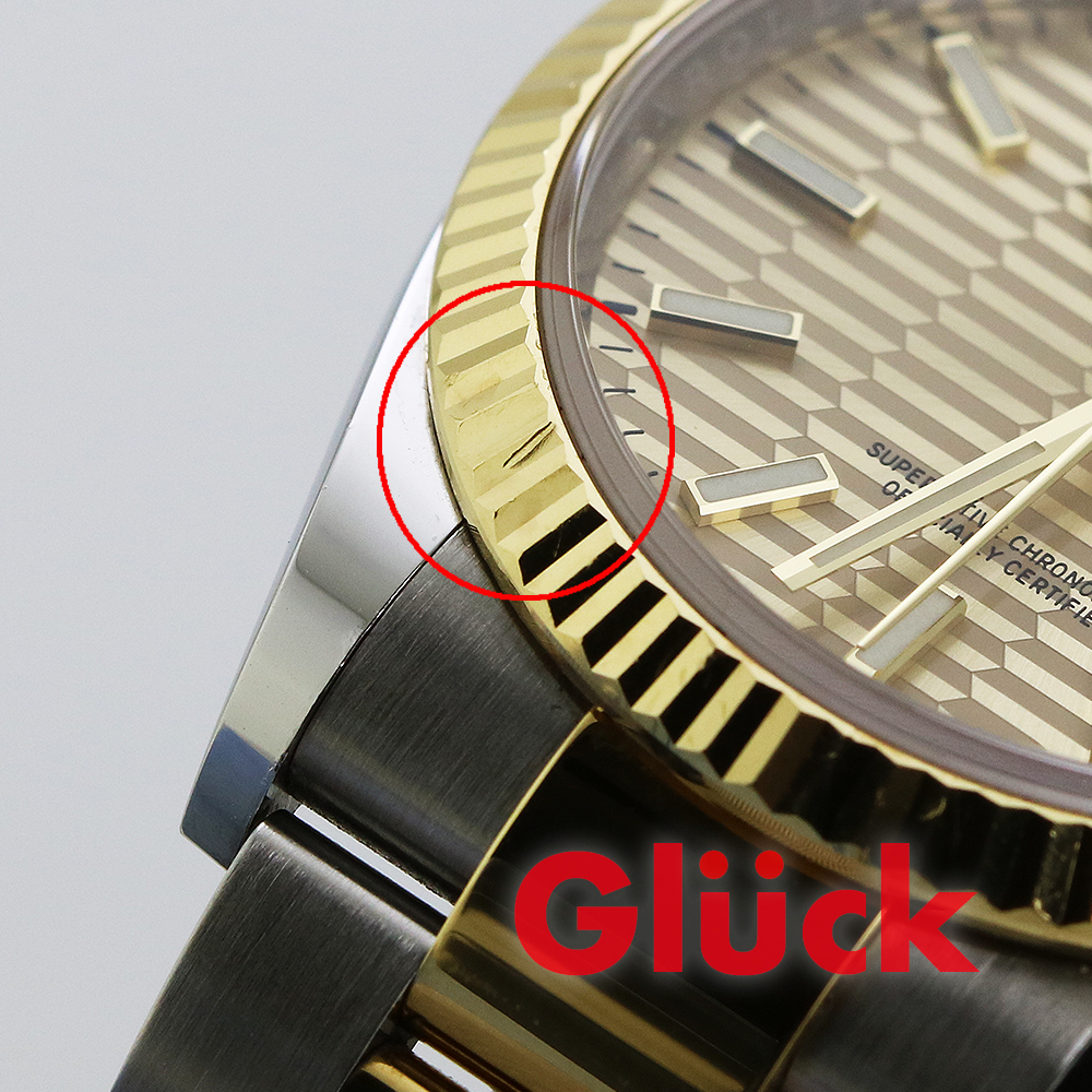 日付表示部のサイクロップレンズに使用キズ、ベゼルに打痕、全体的に使用に伴うキズがあります。