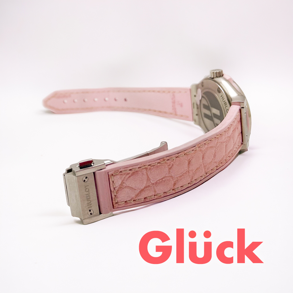 ベゼルにはダイヤモンドがセッティングされており、パールピンクアリゲーターとピンクラバーのベルトです。
