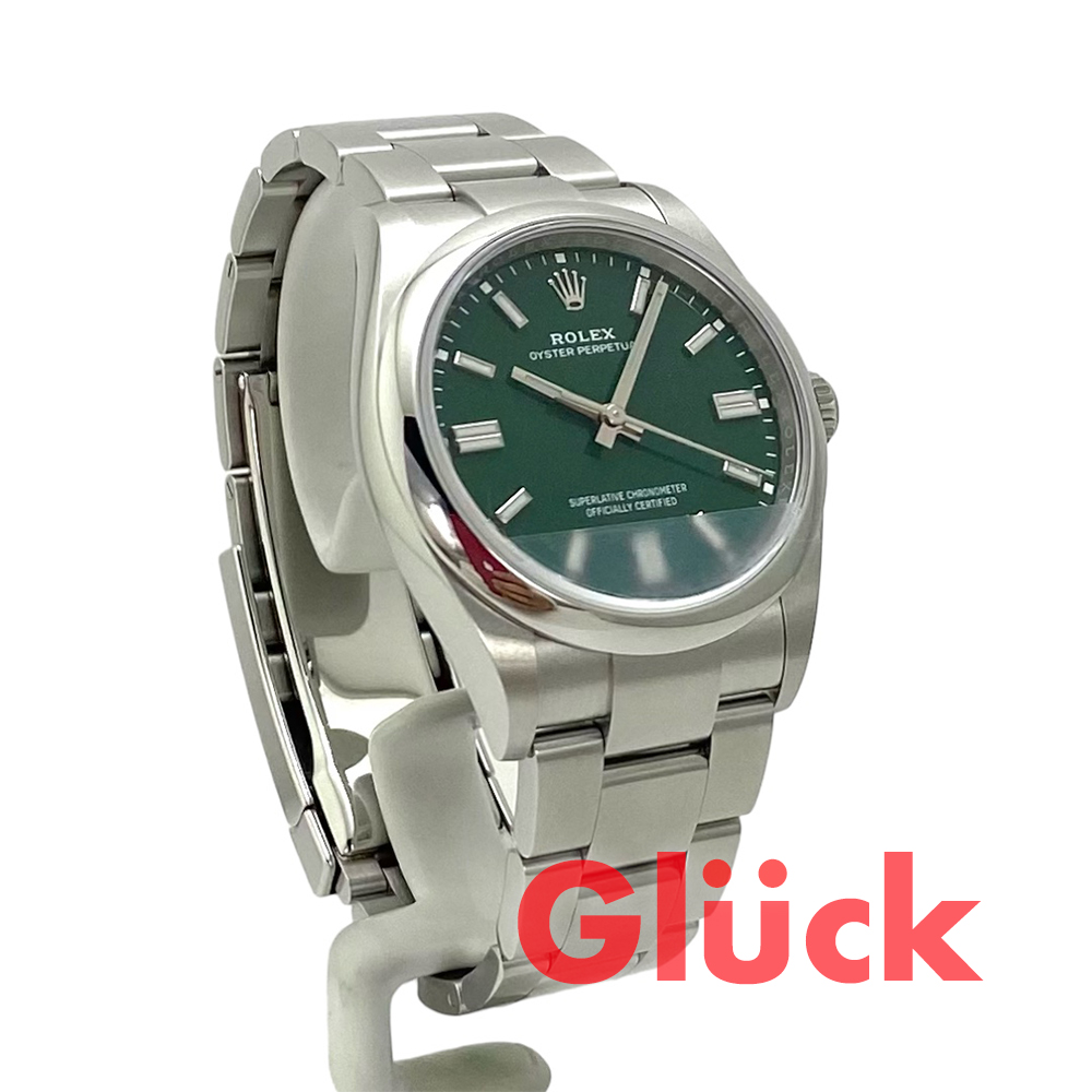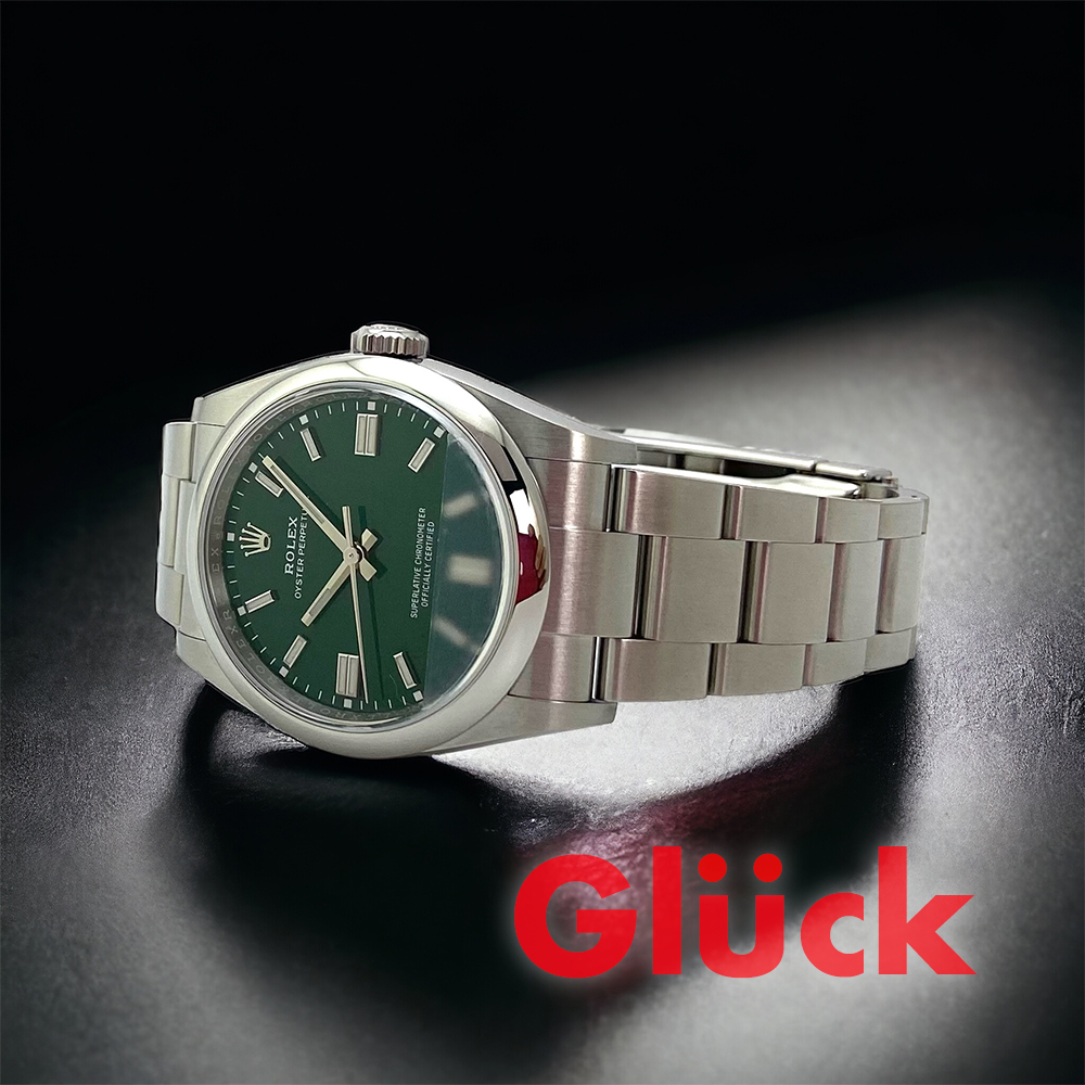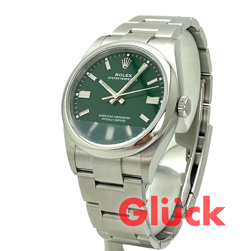 グリーンダイアルとオイスターブレスレットを備えた、オイスター パーペチュアル 36です。