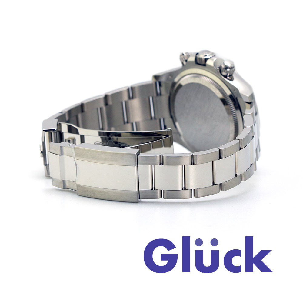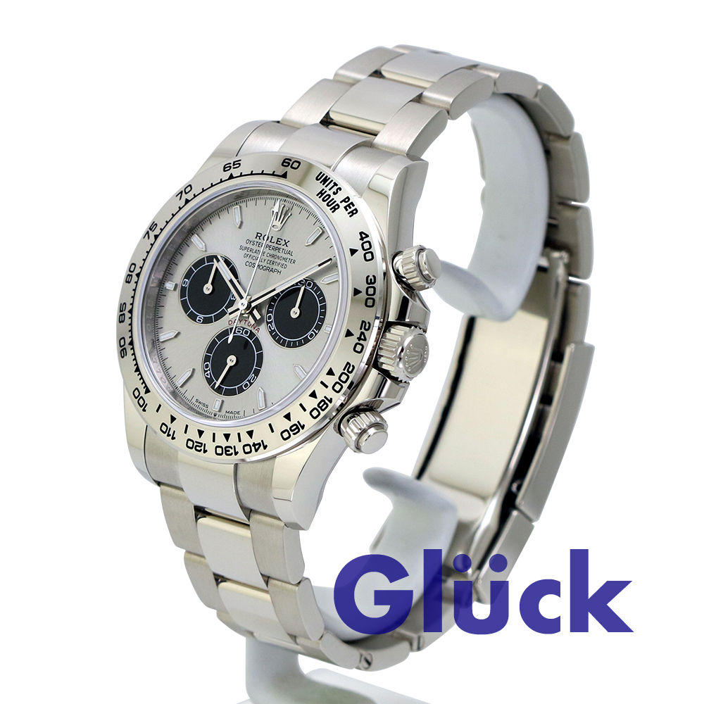 スチール&ブライトブラックダイアルとオイスターブレスレットを備え、18 ct ホワイトゴールドタキメーターベゼルが特徴的なモデルです。