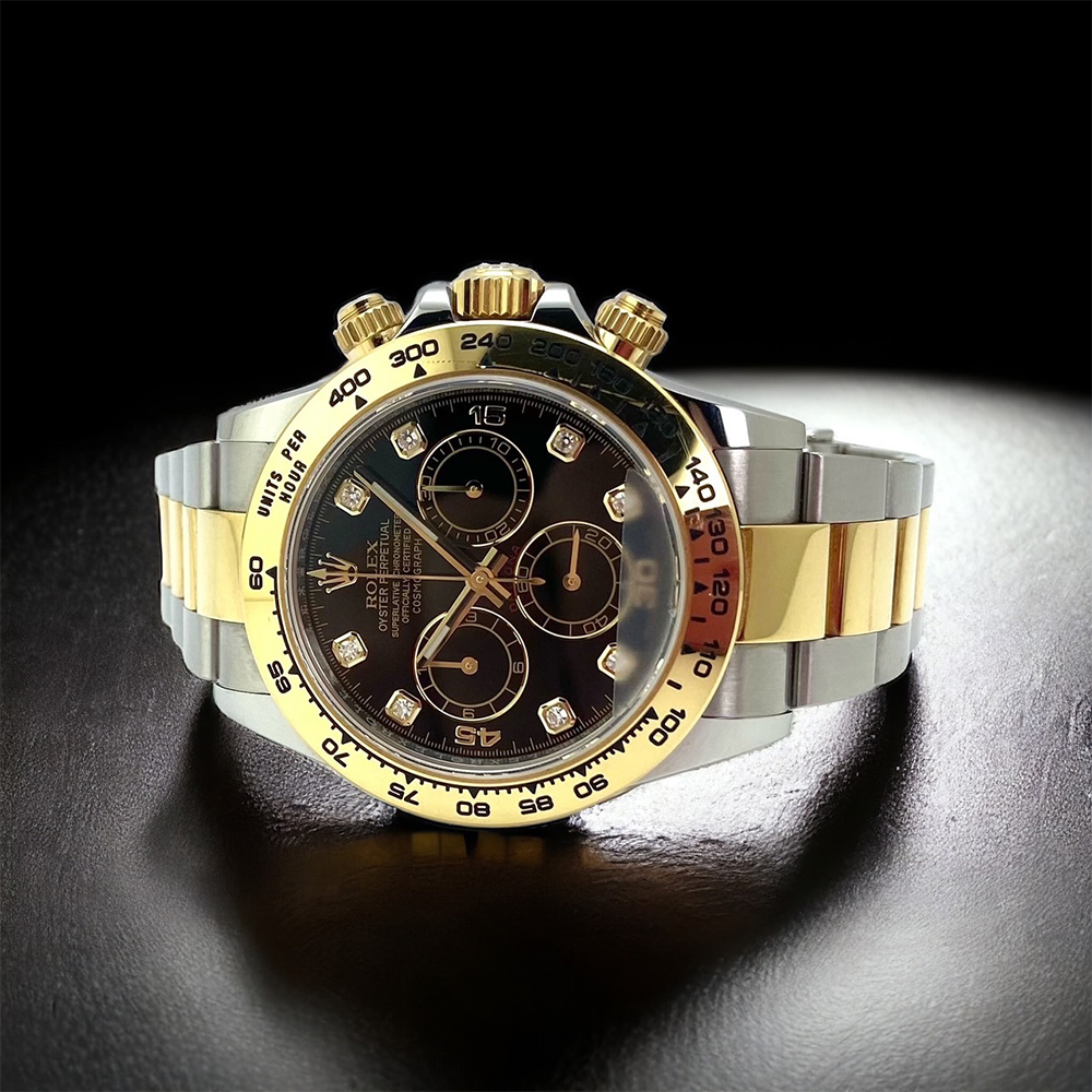 インデックス部分に8個ものダイヤモンドがあしらわれた、ゴージャスなモデルです。